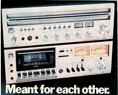 From the beginning it was a love match, each bringing out the best in the other. The AIWA AD-6500 cassette deck and the powerful AIWA AX-7500 receiver. The AD-6500 cassette deck with its exclusive automatic front loading has been the belle of the ball since coming out. The separate transport system automatically loads the cassette into place. Added to this exclusive feature are: Those famous AIWA specs that impress even the most discriminating audiophile. The built-in Dolby N. R. allows the S/N ratio of 62dB (Fe-Cr: tape); the wow and flutter is kept to 0.07% (WRMS); the frequency response from 30 to 17,00 kHz; the 2 step peak level indicator (+3dB, +7dB); the quick cue and review; the Ferrite guard head a 3 step bias and equalizer tape selector in that the AD-6500 will always be out from The AX-7500 is a high powered, low d AM/FM stereo receiver that can hold its with the best. Even the toughest engine have nodded their approval. It boasts 30 per channel minimum RMS at 8 ohms fro 20,000Hz with no more than 0.2% total harmonic distortion. The advanced 3-stage coupled OCL and differential amplifier c equalizer assures stability and excellent transient response. The AIWA AD-6500 and the AIWA AX-7500. The perfect sound relationship. Dolby is a Trademark of Dolby Labs, Distributed in the U.S. by: MERITON ELECTRONICS, INC., 35 Oxford Drive, Moonachie, N.J. 07074. Distributed in Canada by: SHRIRO ( CANADA) LTD., Montreal 256, P Q. Canada.