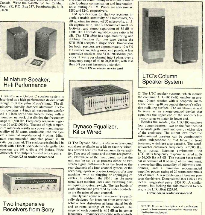 Improved EPI Speaker System The 1-inch inverted-dome tweeter and 8-inch woofer that have long been standard in EPI speaker systems have been improved in mass, mechanical tolerances, and power-handling capability for the new EPI Model 101. The two-way system has a frequency response of 46 to 20,000 Hz and a nominal impedance of 8 ohms. The recommended range of amplifier powers for driving the sys tem is 12 to 75 watts per channel. High-frequency dispersion is said to maintain off-axis frequency response to within approximately 3 dB of on-axis response at 15,000 Hz. The sys tem measures 20 1/4 x 12 x 8 3/4 inches. It is finished in wood-grain vinyl with bronze met al trim surrounding the black foam grille. Price: about $120. Pioneer's New Top-of-line Tuner The TX-9500II has taken its place at the top of Pioneer's line of AM/FM stereo tuners. Among its features are switchable i.f. band width (WIDE or NARROW) to provide a choice between maximum selectivity and maximum signal quality, a built-in test-tone oscillator to aid in setting tape-recording levels, and a choice of two degrees of FM interstation noise muting. Internally, the TX-9500II has a newly developed filter in its i.f. section that combines high effectiveness with phase linearity, plus a new 19-kHz pilot-signal "canceller" said to have much less effect on audio-frequency response than a conventional multiplex filter. Usable sensitivity of the TX-9500II is 1.5 microvolts, with 50-dB quieting achieved at 2.5 microvolts in mono and 35 microvolts in stereo. Capture ratio (in the WIDE i.f. mode) is 0.8 dB, while alternate-channel selectivity is 35 dB in the WIDE mode and 85 dB in the NARROW mode. Other specifications, all for the WIDE mode, include AM suppression of 65 dB, 110-dB spurious-response rejection, and stereo, separation of 35 dB over the range of 50 to 15,000 Hz. Frequency response (stereo) is 20 to 15,000 Hz +0.2, -0.5 dB. Distortion at mid-frequencies is 0.05 percent (mono) and 0.07 percent (stereo). The tuner has two pairs of output jacks, one set at a fixed level and the other variable by means of a front-panel control. A switchable circuit feeds multipath-signal products to the out puts, enabling the user to minimize them by means of antenna orientation. Approximate dimensions of the TX-9500II are 16 1/2 x 6 x 15 1/2 inches. Approximate price: $400, with an optional walnut cabinet costing $35. The next model in the Pioneer line, the TX-8500II, retains most of the features and much of the performance of the TX-9500, but at a price of about $275. Superex Headphones: Low Price, Light Weight The Superex TRL-77 is a non-acoustically isolating stereo headset weighing only 11 1/2 ounces (less cable). With its augmented low end, the TRL-77 has an overall frequency response of 25 to 20,000 Hz. The phones em ploy Mylar diaphragms within compact mold ed earpieces with user-replaceable foam cushions. The padded headband is a single piece of stainless steel. With an impedance appropriate for the headphone jacks of virtually any receiver or integrated amplifier, the headset produces a sound-pressure level of 100 dB with an input of 5 milliwatts. For a mid-range signal at that level, distortion is 0.65 percent. The TRL-77's 7-foot cable terminates in a standard three-conductor phone plug. Suggested price: $30. Elliptical Styli on Audio Technica's Latest Cartridges To make its finest products available to consumers not requiring CD-4 playback, Audio-Technica is offering stereo equivalents of its highly ranked AT15Sa and AT12S phono cartridges with elliptical rather than Shibata styli. The new AT15XE ($100) has a 0.2 x 0.7-mil elliptical stylus, a frequency response of 5 to 30,000 Hz, and stereo separation of 28 dB at 1,000 Hz (23 dB at 10,000 Hz). The recommended range of tracking forces is 3/4 to 13/4 grams. Other specifications are identical to those of the AT15Sa, including the output of 2.7 millivolts for a recorded velocity of 5 centimeters per second. The AT12XE ($60), an adaptation of the AT12S, has a 0.3 x 0.7-mil elliptical stylus and a tracking-force range of 1 to 14/4 grams. Frequency response is 15 to 28,000 Hz, and stereo separation is 24 dB at 1,000 Hz, 18 dB at 10,000 Hz. Digital-readout Heathkit Receiver The top of Heath Company's receiver line is now the AM/FM stereo AR-1515, equipped with a half-inch LED/digital display to indicate the tuned frequency. Power output is 70 watts per channel into 8 ohms on a continuous basis, with less than 0.08 percent harmonic or intermodulation distortion. The high-level in puts have a signal-to-noise ratio of 80 dB. The phono inputs, referred to a 2-millivolt input signal, have a 65-dB signal-to-noise ratio. On FM the AR-1515 has a usable sensitivity of 1.8 microvolts, a capture ratio of 1.3 dB, and alternate-channel selectivity of 100 dB. Image rejection is 90 dB, and AM suppression is 65 dB. The FM frequency response is 20 to 15,000 Hz ±1 dB. Only the main controls-tuning, mode, in put selector, and volume-appear on the front panel. The rest are concealed behind a hinged trim section that flips down. These include main and remote speaker switching, balance, bass, and treble controls, FM interstation noise muting, high-frequency blend (for FM), tone-control defeat, high-frequency and sub sonic filters, and tape-monitor switching. There is also a stereo headphone jack and tape-dubbing inputs and outputs augmenting those on the rear panel, plus a pushbutton for a Dolby decoder for Dolbyized FM broad casts that can be purchased optionally (in kit form) and installed by the user. The AR-1515 also has channel-center and signal-strength tuning meters as well as illuminated callouts for input selection and mode. The Heathkit AR-1515 is available only in kit form. Approximate overall dimensions are 21 1/2 x 6 1/4 x 15 inches, including the decorative wood end pieces supplied. Price: $549.95. The optional Dolby FM module costs $39.95. Time-coherent Drivers in Ultraphase Speakers The Ultrap