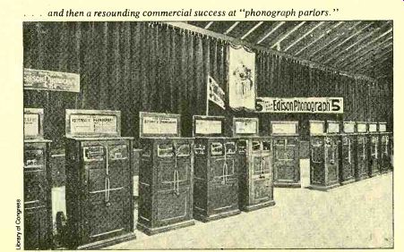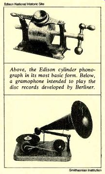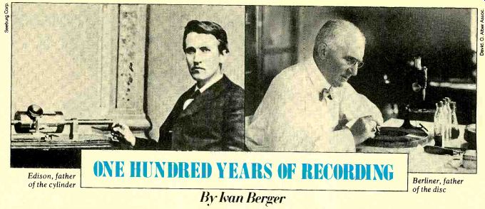ONE HUNDRED YEARS OF RECORDING -- "If Edison hadn't invented the phonograph, someone else would have". IVAN BERGER ![]() --- Edison, father of the cylinder; Berliner, father of the disc. ONE HUNDRED YEARS OF RECORDINGBy Ivan Berger THOMAS ALVA EDISON was somewhat deaf. That didn't stop him. Perhaps it even made him extra-sensitive to what he did hear--and its implications. After all, hadn't he nearly invented the telephone? And hadn't he already made more money from telephone patents than Alexander Graham Bell, the man who had succeeded in inventing it in 1876, just one year earlier? Edison, Bell, and Elisha Gray were all starters in a race to be the first with one invention-a "harmonic tele graph" that could send several messages at once over one pair of wires and wound up racing to turn that idea into a telephone. Bell beat Gray to the patent office by mere hours, and Edi son didn't discover until too late that one of his attempts could carry voices, too. So when Edison's next telegraph invention, a dot-and-dash recorder, began to make a "humming sound, resembling human talk heard indistinctly" when played at high speed, Edison was ready at once to change direction toward something that would resemble human speech heard distinctly: the phonograph. From History's standpoint, he needn't have bothered. If Edison hadn't invented the phonograph, someone else would have--and soon. Charles Cros, a French amateur scientist, photographer, and poet, had already conceived of a working phonograph some months before. But, perhaps because he was a poet, he lacked either the money or the technical ability to actually construct one. He safeguarded his place in history (but little else) by depositing his idea with the Academie des Sciences, and it would be ten years before his ideas would be fully implemented. Edison had invented and built the first recorder, but Cros, for all the good it did him, had invented the flat, replicable disc. The phonograph actually spoke, shocking Edison almost as much as word of it would later shock Cros. Edison was no great sophisticate, but even he might have chosen more historic words for the first test than "Mary had a little lamb" had he expected History would hear them. "I was never so taken aback in my life," he later said. "I was always afraid of things that worked the first time." But Edison did not build the first "talking machine"--not even, as he is reputed to have jested later, the first talking machine that could be shut off. Nor did he, strictly speaking, build the first recorder. What he did build was the first machine that could record sound and then play it back again. Attempts at making machines that would talk go back in legend to the time of Roger Bacon and Albertus Magnus, and some semi-successful nineteenth-century attempts were well known (even Barnum got into the act). Machines that recorded sound visually went back at least to the late eighteenth century. In 1802, Thomas Young designed such a recorder using many of the techniques Edison re invented seventy-five years later, plus a parabolic recording horn better than Edison's conical one. And in 1857, Edouard Leon-Scott built a device that traced sound waves on smoke blackened paper. Edison’s phonograph was remarkably simple in construction. A spiral-grooved brass cylinder wrapped in a sheet of tin foil was turned by a crank while a needle mounted on a tele phone-like diaphragm embossed a record of its up-and-down movements onto the tin foil. The recording would wear out after only a few plays, and Edison himself later admit ted that "no one but an expert could get anything intelligible back from it," but no one questioned that it was a marvel. And it made money from the start. By January of 1878, a company had been formed to manufacture and exhibit the little wonder, and some exhibitors found that a single phonograph could earn them over $1,000 a week. Meanwhile, Edison kept working on his baby and coming up with fresh ideas. A patent application of early 1878 suggested such ideas as the disc phonograph (easier to attach the foil to, but suffering from inner-groove distortion), clockwork motors to re place the hand crank, electrotype duplication of the embossed foil, amplified cutting (by magnetic force or compressed air), noise reduction (by magnetic repulsion of a steel needle and an iron record), tape recording (but not magnetic tape), multi channel records (probably just to increase clarity and volume), electrical recording (though probably just for telephone use), and speaking toys. In an article that same year, he predicted such uses as dictation, talking books for the blind, elocution teaching, music, family voice albums, speaking clocks, language instruction, recording school classes for later review, and telephone recording. Others suggested that the new invention could preserve the voices of the dead (from its frequent mention this seems to have been a particularly powerful idea to Victorians), sound-effects records ("the puffing and rush of the rail road train ... "), audio complaint boxes, "musical kaleidoscopes" that would create new tunes by playing old ones backwards (another idea that seems to have caught the nineteenth century imagination firmly), recorded drama, and the voices of "great singers . . . put into the hand organs of the streets." Of course, the infant phonograph was not yet good enough to carry out any of these sound predictions. As one contemporary writer put it: The tone of the phonograph is usually rather shrill and piping, but ... The instrument, when perfected ... will undoubtedly reproduce every condition of the human voice. But it was not to be perfected soon. The novelty wore off, the crowds drifted away, and so did Edison, off to launch his ten-year effort to produce the electric light and the generating and power systems that would make it workable. By 1886, however, Alexander Graham Bell, his cousin Chichester Bell, and Charles Sumner Tainter had patente