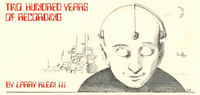 TWO HUNDRED YEARS OF RECORDING--A slightly unsettling look at what it all could eventually lead to. by LARRY KLEIN. ![]() ------------ THE fact that this year, 2077, is the Bicentennial of sound recording has gone virtually unnoticed. The reason is clear: electronic recording in all its manifestations so pervades our everyday lives that it is difficult to see it as a separate art or science, or even in any kind of historical perspective. There is, nevertheless, an unbroken evolutionary chain linking today's "encee" experience and Edison's successful first attempt to emboss a nursery rhyme on a tinfoil-coated cylinder. Elsewhere in this Transfax printout you will find an article from our archives dealing with the first one hundred years of recording. Although to day's record/reproduce technology has literally nothing in common with those first primitive, mechanical attempts to preserve a sonic experience, it is instructive from a historical and philosophical perspective to examine the development of what was to become known as "high fidelity." Primitive Audio It is clear from writings of the time that the period just after the year 1950 was the turning point for sound re production. For a variety of sociological, economic, and technological reasons, the pursuit of accurate sound re production suddenly evolved from the passionate pastime of a few engineers and Bell Laboratories scientists into a multimillion-dollar industry. In the space of only fifteen years, "hi-fi" be came virtually a mass-market commodity and certainly a household term. In the late 1970's, the first primitive micro-processors (miniature computer-type logic-plus-memory devices) appeared in home audio equipment. These permitted the user to program what was known as an "FM tuner," "record player," or "tape recorder" to follow a certain procedure in delivering broadcast or recorded material. For those who are not collectors of those antique audio devices which employed "records" or "tapes," such terms require explanation. From its earliest beginning, recording employed an analog technique. This means that whatever sound was to be preserved and subsequently reproduced was converted to an equivalent corresponding mechanical irregularity on a surface. When playback was desired, this irregularity was detected or "read" by a mechanical sensing device and directly (later, indirectly) reconverted into sound. It may be difficult to believe, but if, say, a middle-A tone (which corresponds to air vibrating at a rate of 440 times per second) was recorded, the signal would actually consist of a series of undulations or bumps which would be made to travel under a very fine-pointed stylus at a rate of 440 undulations per second. Looking back from a present-day perspective, it seems a wonder that this sort of crude mechanical technique worked at all--and a veritable miracle that it worked as well as it did. The End of Analog Magnetic recording first came into prominence in the 1950's. Instead of undulations on the walls of a groove molded in a nominally flat vinyl disc, there were a series of magnetic pat terns laid down on very long lengths of thin plastic tape coated on one side with a readily magnetized material. However, the system was still analog in principle, since if the 440-Hz tone was magnetically recorded, 440 cycles of magnetic flux passed by the reproducing head in playback. All analog systems--no matter what the format suffered from the same inherent problem (susceptibility to noise and distortion), and the drive for further improvement caused the development of the digital audio recorder. Simply explained, the digital recording technique "samples" the signal, say, 50,000 times a second, and for each instant of sampling it assigns a digitally encoded number that indicates the relative amplitude of the signal at that moment. Even the most complex signal can be assigned one number that will totally describe it for an instant in time if the "instant" chosen is brief enough. The more complex the signal, the greater the number of samples needed to represent it properly in encoded form. In the late Seventies and early Eighties, digital audio tape recording proliferated on the professional level, and slightly later it also became standard for the home recordist. Many of the better home video-tape recording systems were adaptable for audio recording; they either came with built-in video-to-audio switching or had accessory converters available. The video disc, first announced in the late 1960's, progressed rapidly along its own independent path, since it benefited from many of the same technical developments as the other home video and digital products. By the mid-1980's a variety of video-disc players were available that, when fed the proper disc, could provide both large-screen video programs with stereo sound or multichannel audio with separate reverb-only channels. The flat semiconductor TV screen that was available in any size desired appeared in the early 1980's. It was the inevitable outgrowth of the light-emitting diode (LED) technology that provided the readouts for the electronic watches and calculators that were ubiquitous during the 1970's. Later in the decade, giant-screen home video faced competition from the holographic recording/ playback technique. Whether the viewer preferred a three-dimensional image that was necessarily limited in size and confined (somewhat) in spatial perspective or a life-size two-dimensional one ultimately came down to the specifics of the program material. In any case, the two non-compatible formats competed for the next twenty years or so. LSI, RAM, and ROM By the late 1980's, the pocket computer (not calculator) had become a reality. Here too, the evolutionary trend had been clearly visible for some time. The first integrated circuits were built in the late 1950's with only one active component per "chip." By the end of the Seventies, some LSI (large-scale integrated circuit) chips had ove