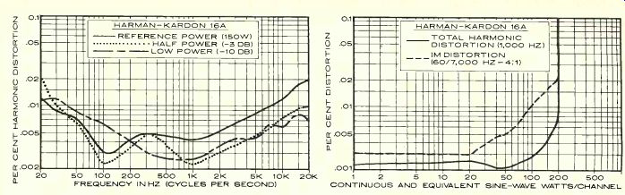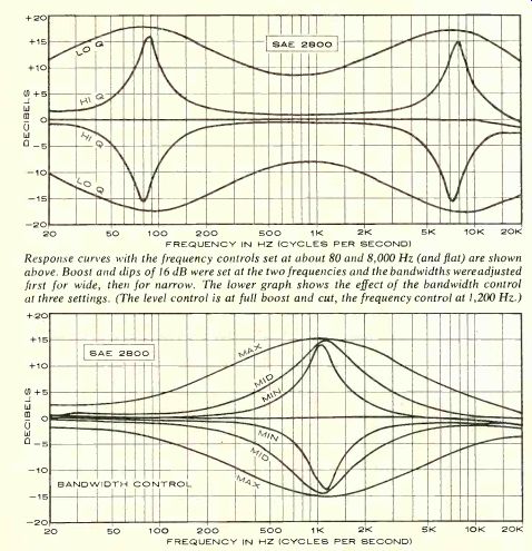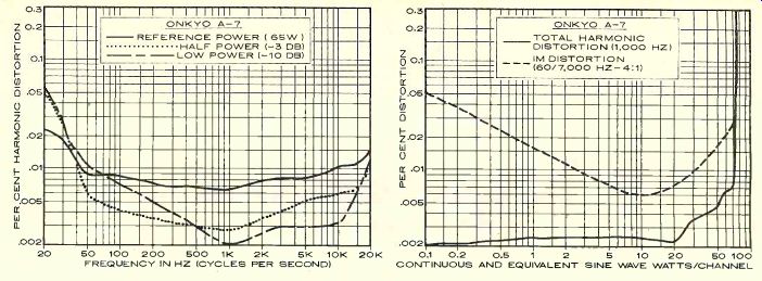 EQUIPMENT TEST REPORTS: Hirsch-Houck Laboratory test results on the Onkyo A-7 integrated stereo amplifier, Heath AD-1307 audio control center, Koss ESP/10 electrostatic headphones, Harman-Kardon Citation 16 and 16A stereo power amplifiers, and SAE Mode12800 stereo parametric equalizer. By Hirsch-Houck Laboratories ------------ Onkyo A-7 Integrated Stereo Amplifier![]() ONKYO'S Model A-7 is that company's finest integrated stereo amplifier, rated to deliver 65 watts per channel to 8-ohm loads from 20 to 20,000 Hz with less than 0.1 percent total harmonic distortion. Its frequency response is specified well beyond the audio range, with a ±1 dB rating from 2 to 80,000 Hz. This accounts for its excellent low-frequency square-wave response. (A 50-Hz square wave is said to emerge from the amplifier with less than 5 percent tilt on its top and bottom, indicating flat response with out significant phase shift to well below 5 Hz.) The Onkyo A-7 has a thick brushed-satin aluminum panel and machined metal knobs that give it an exceptionally rugged appearance-which is more than skin deep, we might add. Volume is adjusted by a large, heavy knob that operates a true thirty-two step switch attenuator (as opposed to the more common potentiometer control with mechanical detents). The upper eighteen steps adjust the volume in 1-dB increments, in creasing to 2-dB and larger steps as the volume is further reduced. Three bar knobs in the center of the panel select the program source and control the two tape decks that can be connected to the A-7. The input selector has positions for two magnetic phono cartridges, tuner, and a high-level (Aux) input. The MONITOR switch connects either the selected source or the playback output from tape deck 1 or tape deck 2 to the amplifier. The DUBBING switch cross-connects the two tape decks so that tapes can be copied from either machine to the other. To the left of these controls are the bass and treble tone controls. Each is an eleven-position selector switch, boosting or cutting the response in 2-dB steps. Below each control is a smaller knob that serves to bypass the tone-control circuits entirely or change the turnover frequency. The bass-turnover frequencies are 125 and 400 Hz, and the treble frequencies are 2,000 and 8,000 Hz. The SPEAKERS switch connects either, both, or neither of two pairs of speakers to the amplifier outputs. The other controls, principally pushbut tons, include the power switch (with a nearby pilot light), SUBSONIC and high-frequency filters, the mono/stereo MODE switch, LOUD NESS compensation, and a 20-dB audio MUT ING switch. The balance control and a stereo-headphone jack complete the front-panel features. At the amplifier's rear, in addition to the signal inputs and outputs, there are separate preamplifier outputs and power amplifier inputs joined by jumper links. Insulated binding posts are used for the speaker connections, and one of the three a.c. outlets is switched. The Onkyo A-7 is 17 1/2 inches wide, 15 inches deep, and 6 1/4 inches high. It weighs about 30 pounds, including the furnished black metal protective cabinet. Price: $350. Laboratory Measurements. Probably be cause the Onkyo A-7 carries a modest power rating for an amplifier of its size and weight, it became only slightly warm during the one-hour FTC preconditioning period. The output, with both channels driven at 1,000 Hz into 8-ohm loads, clipped at about 76 watts per channel. The 4- and 16-ohm outputs were 105 and 48 watts. The total harmonic distortion (THD) at 1,000 Hz was essentially the residual of our test instruments (0.002 to 0.0025 percent) from 0.1 to more than 20 watts output. It increased to 0.0045 percent at 50 watts and to 0.007 percent at 70 watts. The inter-modulation distortion (IM) was 0.05 percent at 0.1 watt; it decreased to 0.006 percent in the vicinity of 10 watts and rose to 0.028 percent at 70 watts. It also rose at extremely low power levels, to 0.19 percent at 6 milliwatts output. The Onkyo A-7 was driven to a reference output of 10 watts by a high-level input of 62 millivolts or a phono input of 1 millivolt. The respective unweighted noise levels, referred to 10 watts, were-78 and-74 dB, both excellent figures. The phono preamplifier stage overloaded at a high and safe 235-millivolt in put. The manufacturer points out that precision components are used for the RIAA equalization circuits of the A-7, so that its equalization accuracy is rated at ±0.3 dB from 30 to 15,000 Hz. That is exactly what we measured, and the same tolerance applied in fact to the extended phono response from 20 to 20,000 Hz. There was virtually no interaction with phono-cartridge inductance, which increased the output by only about 0.8 dB at 20,000 Hz. The selectable tone-control turnover frequencies of the A-7 give it considerable flexibility in meeting specific response needs. However, we noted that the maximum range of the bass control, in particular, was far larger than it needed to be. With the 400-Hz turn over, about 23 dB of boost was available at 20 Hz, and with the 125-Hz turnover the maximum boost was almost 20 dB at 20 Hz and still increasing at lower frequencies. These controls should be used with caution, since it would be easy to overdrive a speaker (or the amplifier itself) at very low or high frequencies by indiscriminate use of bass boost. The loudness compensation, which boosted both low and high frequencies, was very mild in its action and therefore more listenable than most such systems (especially if the audio muting is used so that the volume control can be operated in the upper half of its range). The SUBSONIC filter is rated to take effect be low 10 Hz with a 6-dB-per-octave slope. It affected the output at 20 Hz by less than 1 dB. The HIGH filter also had a 6-dB-per-octave slope, with the-3-dB response point at 5,500 Hz. It was about as effective as such a gradual filter can be since the cut-off frequency is well chosen for reduction of noise wit