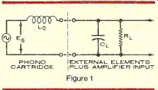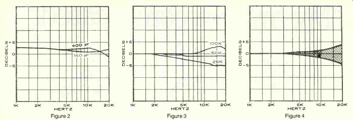 By locating the electrical resonance peak at the correct frequency in relation to the mechanical resonance, and by adjusting the amplitude properly, the cartridge designer can compensate for much of the mechanical high-frequency loss by using the boost from the electrical resonance. If all goes well, the result is a flat response through the audio range. To ensure the correct frequency and amplitude for the electrical resonance, the cartridge designer must specify the proper resistance and capacitance loads. In most cases, the resistance is the now-standard 47,000 ohms (nominally 50,000 ohms) used in all phono preamplifier input stages (100,000 ohms for CD-4 cartridges). The capacitance is much more difficult to predict, however, owing to variations in the length and type of shielded cable connecting the record player to the amplifier and similar differences in the wiring within the tone arm. In addition, the capacitance of the input circuits of phono preamplifiers is far from standardized and can be almost anything from nearly zero to hundreds of picofarads (pF). A typical stereo cartridge is designed to operate with a capacitive load of 250 to 300 pF. This matches fairly well the actual situation existing in a hi-fi installation. Fortunately, the exact capacitance is not very critical. Some manufacturers, notably Shure and Ortofon in their non-moving-coil models, design their cartridges for flattest response when loaded by 400 to 500 pF, and many music systems will require the addition of external capacitors to achieve these values. What is the actual result of a load-capacitance mismatch? The effect depends to a great extent on the inductance of the cartridge's coils as well as other characteristics. A low inductance implies less dependence on critical loading for a correct frequency response (un fortunately, it also implies a lower output voltage, all else being equal). We made frequency-response measurements on a cartridge having the moderately low inductance of 580 millihenries and whose specifications are based on a 275-pF capacitive load in parallel with 47,000 ohms. The results of changing the total capacitance from 160 to 400 pF, with the resistance maintained at 50,000 ohms, are shown in Figure 2. The effect of the capacitance change, though hardly of major magnitude, might change the sound of the cartridge enough to influence some people's choice, and it might easily be overlooked by many others. The correct load of 275 pF gave a response curve essentially identical to the one shown for 160 pF. Notice that a higher load capacitance does not reduce the apparent high-frequency response of the cartridge. Quite the contrary: it gives about 2 dB more output in the most audible part of the high-frequency range, and on many systems will make most records sound brighter, more "open," more "de tailed," and so forth. The output loss above 15,000 Hz is much less likely to be audible. When we fixed the capacitance at 250 pF and varied the resistance termination from 25,000 ohms to 100,000 ohms, the effects were much more pronounced. Figure 3 shows the impressively flat response obtained with the rated load of 50,000 ohms. Despite its specification, the actual input resistance of an amplifier may differ somewhat from the nominal 47,000 ohms. According to the results of a survey of twenty-six different phono preamplifiers printed in the Boston Audio Society's Speaker in April 1977, input resistances fell between 35,000 and 60,000 ohms. Judging from the curves we measured at 100,000 and 25,000 ohms on this cartridge (it is quite typical in its reaction to load changes), audible response might be affected materially by the choice of amplifier.