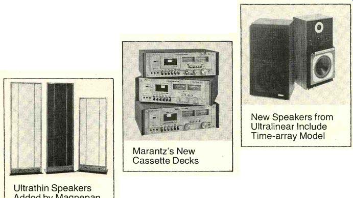 NEW PRODUCTS: Roundup of the latest audio equipment and accessories.New Full-range Isolating Headphones From Superex ![]() Superex is launching a new line of stereo headphones with the SM-700 "Studio Master," a dynamic headphone using 2 3/4-inch Mylar-diaphragm drivers in vented enclosures. The 10-ounce headphone has Leatherette-covered foam cushions that rest on the ear, isolating it from outside sounds. The met al headband is also covered with foam pad ding, and a 15-foot extended retractable cable with a clothing clip is provided. The frequency response of the SM-700 is rated at 10 to 20,000 Hz ±3 dB. Distortion is rated at 0.25 percent for a 400-Hz signal at a sound-pressure level of 110 dB. A 0.6-volt (10-milliwatt) input is required to produce this acoustic output. Impedance is a nominal 35 ohms. Price: $65. Sony is offering three new quartz-controlled direct-drive turntables, the PS-X7 (shown), PS-X6, and PS-X5. Each has a quartz-crystal oscillator that generates a stable reference signal; this is compared with a signal derived from the platter's speed, and speed fluctuations are then corrected by a ser vo system. All three turntables are semi automatic and have a safety clutch in the tone-arm return mechanism. Operating controls (other than speed and record-size selection) are located on the front panel of the base and can be manipulated with the dust cover closed. The turntable bases are made of an acoustically inert material and mounted on liquid-filled feet to prevent acoustic feedback. The top-of-the-line PS-X7 features a car bon-fiber tone-arm shaft as well as a liquid-filled turntable mat. Both the PS-X7 and PS-X6 have an optical sensor- that triggers the tone-arm return mechanism as well as touch-sensitive front-panel switches for the start/ stop and repeat functions. Key specifications are identical for all three turntables and include 0.025 percent wow and flutter (wrms), better than 99.99 percent speed accuracy, and a rumble level of-73 dB (DIN B weighting). All three have approximate dimensions of 6 x 17 1/2 x 14 3/4 inches. Prices are $330 for the PS-X7, $275 for the PS-X6, and $230 for the PS-X5. Osawa announces two additions to its Sat in M-18 series of moving-coil phono cartridges. The M-18E and M-18X are basically similar to the M-I8BX cartridge already on the market but are lower in cost and have different stylus assemblies. The M-18 series cartridges do not require a pre-preamplifier ("head" amp) since they have rated outputs of 2.5 millivolts, suitable for a standard magnetic phono input. The M-1 8E and M-18X use the Satin's fixed-point pivot in the stylus-cantilever mechanism for improved groove tracing and a specially formulated viscous fluid for damping. The- M-18E, with a 0.2 x 0.8-mil elliptical diamond stylus, has a frequency response of 10 to 30,000 Hz. The M-18X is rated at 10 to 35,000 Hz and is intended for both stereo and CD-4 four-channel use; it has a 0.1 x 2.5-mil Shibata stylus. Compliance is 15 x 10-6 centi meters per dyne for each cartridge, and the recommended tracking-force range is 0.5 to 1.5 grams. Price of the M-18E is $195; of the M-18X, $250. Koss has taken the plunge into the dynamic-speaker market with three new systems de signed according to Thiele's vented-box loud speaker theory and using Small's computer methods to optimize parameters. The new line consists of the CM 1010, a passive radiator system, and the CM 1020 and CM 1030 (shown) ported systems. The CM 1030 is a four-way system with a 10-inch woofer, two 4 1/2-inch mid-ranges, and two 1-inch high-frequency dome drivers for the lower- and upper-treble ranges. Crossover points are at 400, 2,500, and 6,000 Hz. The system has dual ports for supplementing bass output. The high-frequency drivers are loaded with different phase plugs, which increase their efficiencies but restrict their bandwidths, so that one covers the 2,500- to 6,000-Hz range and the other is active above 6,000 Hz. There are three level controls on the CM 1030, for mid range, treble, and high treble. Each is a three-position switch with settings of +3, 0, and-3 dB. Overall on-axis frequency response in the far field is 26 to 20,000 Hz ±3 dB. Far-field response is down 3 dB at 70 degrees off-axis and 6 dB at 80 degrees off-axis. A sound-pressure level of 96 dB is produced at a 1-meter distance on-axis with a 1-watt input; Koss recommends amplifiers delivering between 15 and 200 watts per channel continuous power into 8 ohms. The speaker is fused to prevent overload. Nominal impedance is 7 ohms. The cabinet, which measures 39 x 16 1/2 x 14 1/2 inches, is finished in pecan veneer and has brass lift handles on the sides. The CM 1020 uses drivers similar to the CM 1030's but in a three-way configuration with one mid-range and one high-frequency driver. The CM 1010 is a two-way system with an 8-inch woofer and a 1-inch dome tweeter; its 10-inch passive radiator can be adjusted for flat response to 35 Hz or for augmented output in the 50- to 80-Hz range (with the rolloff occur ring at 40 Hz) using a removable weight attached to the center of the diaphragm. Both of these units are finished in pecan veneer. Price of the CM 1030 is $395; of the CM 1020, $295; and of the CM 1010, $195. ![]() IMP Teac's New Three-head Elcaset Deck Teac's new elcaset deck, the AL-700, is a three-head, three-motor machine employing the new quarter-track, two-channel cassette format. The AL-700, like other elcaset machines, has a detector that automatically senses tape type (ferric, ferrichrome, or chromium-dioxide) according to coded notches on the elcaset shell, and it sets bias and equalization accordingly. The transport can be started automatically with a timer, and a photoelectric sensor detects the end of the tape and disengages the transport mechanism. A memory function for tape stop and replay is also included. The AL-700 has built-in Dolby noise-reduction circuitry; in addition, it will inter face with an external compander and has a 