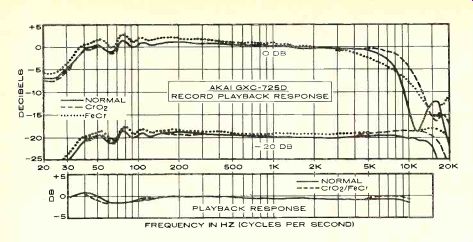 Equipment Test Reports By Hirsch-Houck Laboratories ---------------- Akai GXC-725D Cassette Deck THE Akai GXC-725D is a moderately priced, front-loading, three-head cassette deck powered by a single electronically controlled d.c. motor. The transport mechanism is operated by the familiar row of levers below the cassette opening. Akai has arranged things so that the levers of the GXC-725D can be used in any sequence without going through STOP. A single lever serves for both STOP and EJECT functions; the first pressure (even a very light one) stops the tape, and releasing it and pressing again opens the cassette door. The cassette is loaded into retaining clips built into the hinged door. The door opens quietly, with a slow damped motion. It can be removed easily for cleaning or demagnetizing the heads. Most of the cassette can be seen through the window in the door, and it is back-lit so that one can always see how much tape remains to be played. The recording and playback heads of the Akai GXC-725D, though electrically and magnetically separate, are built into the same housing, which fits through the hole in the edge of the cassette usually occupied by a combination record/playback head. Since the azimuths of the two head gaps are set precisely during manufacture, the GXC-725D does not require the alignment adjustments that are necessary with cassette recorders using physically separate recording and playback heads. The cassette opening at the left of the panel is flanked by a pushbutton power switch and an index counter with reset button. The upper right portion of the panel is devoted to two large illuminated VU meters calibrated from -20 to +5 dB. Between them is a PEAK LEVEL light that flashes when brief signal peaks reach +7 dB. ------------ FREQUENCY IN HZ (CYCLES PER SECOND) Below the meters are the two recording-level controls and a single playback-level control. Two indicator lights show when the machine is set for recording and when the Dolby system is turned on. Across the bottom of the panel, to the right of the transport controls, are pushbutton switches for MONITOR (delivering either the input source or the playback-output signals to the line outputs), DOLBY noise reduction, and the MPX FILTER that re moves any 19-kHz pilot signal remaining in an FM stereo program, which might affect the operation of the Dolby circuits. There is a TAPE SELECTOR knob that simultaneously changes bias and recording and playback equalization for four basic tape formulations. These are identified as LN (low noise), LH (low noise/high output), CrO2, and FeCr. A stereo headphone jack and two microphone jacks complete the front-panel features. The line input and output jacks are in the rear. The instruction manual for the Akai GXC-725D contains complete performance specifications, which are too lengthy to repeat here. It also has a table listing the recommended settings of the TAPE SELECTOR for some twenty-five types of tape and shows the "reference" tape used for each of the switch settings to establish the recorder's performance specifications. The Akai GXC-725D is supplied in a vinyl-clad wooden cabinet finished in simulated walnut grain. It is approximately 17 1/2 inches wide, 111/4 inches deep, and 61/2 inches high and weighs about 15 pounds. Price: $399.50 Laboratory Measurements. The playback frequency response was measured using TDK AC-331 and Nortronics AT200 test tapes for the "standard" 120-microsecond equalization, and Teac 116SP tape for the 70-microsecond equalization used with CrO2 and FeCr tapes. In both cases the response was within ±1 dB over the full range of the tape (31.5 to 10,000 Hz), most of the variation being at the lower frequencies. The record-playback frequency response was measured for each of the tape-selector positions using the recommended reference tape or a close equivalent. For the LN and LH tapes we used TDK SD and Maxell UD XL in place of the specified Fuji FL and Max- ell UD tapes. We also tried a Scotch Master tape with the LH setting. It is interesting to note that the CrO2 performance of the recorder is specified only with cobalt-treated ferric "chrome equivalents" such as TDK SA and Maxell UD-XL II, and no actual chromium-dioxide tapes are listed in the table. We tested the machine with the recommended TDK SA and also with BASF Chromdioxid Super. Finally, the FeCr position was checked with the recommended Sony Ferrichrome and the al ternate Scotch Classic. Although there were of course differences in frequency response between the tapes, the similarities between them were striking. For example, the overall response of the TDK SD and Maxell UD-XL were virtually identical over most of the audio range. Most of the deviation from flatness was in the low-frequency "ripples" caused by the head geometry. The overall response was within ±2 dB from 36 to 13,000 Hz with SD and from 34 to 15,000 Hz with UD-XL. Scotch Master (LH) had a mild high-frequency rise and a ±2-dB variation from 35 to 15,000 Hz. The TDK SA, used as a CrO2 tape, had a slightly stronger and extended high end, with a ±1.5-dB variation from 37 to 16,500 Hz. The BASF chrome tape had a more pronounced high-frequency rise above 4,000 Hz, giving it a ±2.5-dB variation from 35 to 18,500 Hz. The ferrichrome tapes gave the widest and flattest frequency response. Sony FeCr was within-171.5 dB from 36 to 19,000 Hz. Scotch Classic had a very smooth, linear response which sloped down ward slightly. It was within-1.-3 dB from 34 to 17,000 Hz. All these figures result from the tape/machine interface and do not necessarily reflect results that would be obtained with the same tapes on other machines. All measurements were made at a -20-dB recording level. At a 0-dB level there was the expected rolloff of high-frequency response due to tape saturation. However, the loss of highs was much less than we normally measure on cassette decks, and the 0-dB curve remained above the -20-dB curve at all times instead o