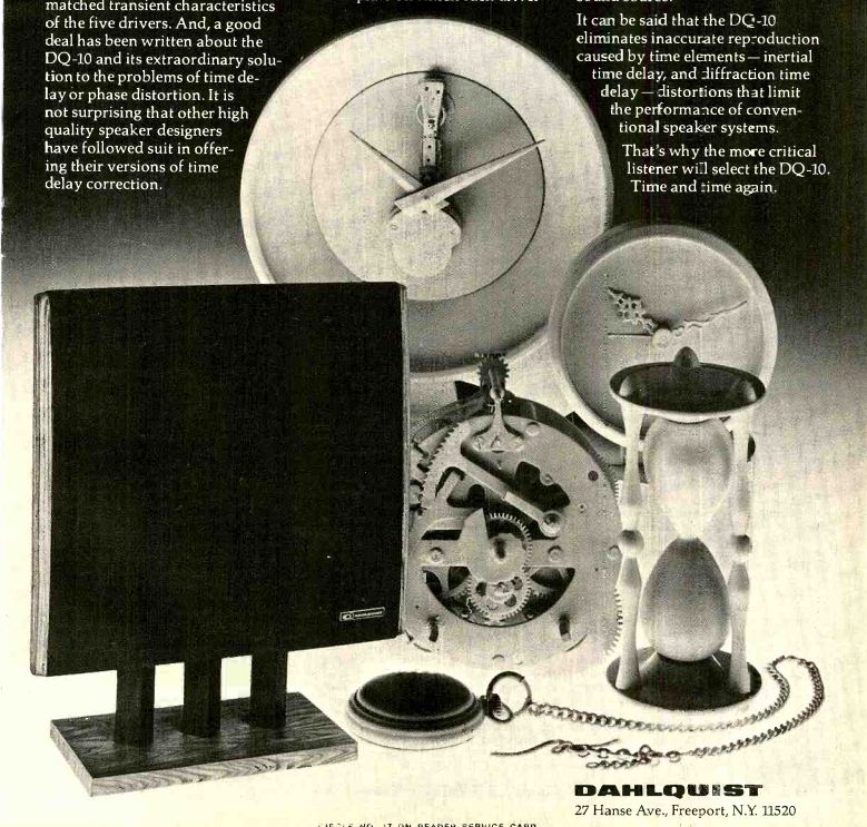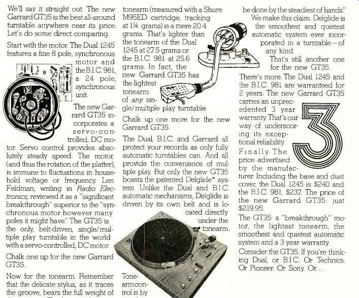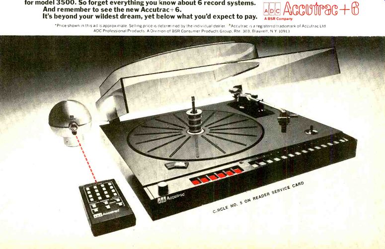 Critics and audiophiles agree the listening quality of the DQ-10 is unexcelled. What accounts for its superb performance? Time Much credit for its smooth coherence must be given to the precisely matched transient characteristics of the five drivers. And, a good deal has been written about the DQ-10 and its extraordinary solution to the problems of time de lay or phase distortion. It is not surprising that other high quality speaker designers have followed suit in offering their versions of time delay correction. ...and Time Again The real "secret' to the unprecedented performance : the DQ-10 lies in Jon Dahlquist's patented method for reducing (*fraction, a more audible and destructive form of time distortion. The separate baffle plate on which each driver is mounted is dimensioned to minimize diffraction in the frequency band in w aich it operates. ![]() Thus. the effect of thesoend we hear is that of a driver mounted in free space, without obstructions or surfaces to distort the original sound source. It can be said that the DQ-10 eliminates inaccurate reproduction caused by time elements--inertial time delay, and diffraction time delay--distortions that limit the performance of conventional speaker systems. That's why the more critical listener select the DQ-10. Time and time again. 27 Hanse Ave., Freeport, N.Y. 11520 USA BSR / ADC ![]() Accutrac+6. Under $100,000. If you wanted to build your own Accutrac+6, you'd need lots of time. And lots of money. At least $100,000 for computer circuitry, electro-optic mechanisms and much more. But you can buy it from us for under $100,000. $99,700 under to be exact. Because you can buy the Accutrac+6 model 3500 for less than $300! But the most incredible thing about the Accutrac+6 isn't the price tag, it's the features. Like computerized track selection. Which in plain English means that you can hear the tracks on each of six records in any order you like, as often as you like. Even skip the tracks you don't like. Literally, it's customized listening. And you never have to touch the tonearm to do it, because the Accutrac+6 is engineered with a computerized "hands-off" tonearm. In fact, once you close the dust cover you never have to touch the records or tonearm again to hear your programmed selections. But the brain in the Accutrac 6 is smart enough to do even more. Like protecting your records. So, instead of dropping your records onto the platter, it lowers them v-e-r-y g-e-n-t-l-y. That's what we said: it doesn't drop your records. Its Accuglide Spindle is like an elevator. In fact, just touch the "raise record" key, and it lifts all six records back up into the starting position. As long as we have you touching the keys, let us tell you how you can control the Accutrac+6 from across the room. With Accutrac- 6 model 3500R you can control everything from across the room with a full-system remote control transmitter and receiver. There's even remote volume control on model 3500RVC. No other 6 record system gives you the record safety, convenience and control of the new Accutrac 6. But the truly incredible feature of the new Accutrac+ 6 is its low price. From under $300* for model 3500. So forget everything you know about 6 record systems. And remember to see the new Accutrac+6. A D It's beyond your wildest dream, yet below what you'd expect to pay. A BSR Comfmni, Accuitrac+0 Price shown in this ad is approximate. Selling price is determined by the individual dealer. Accutrac is a registered trademark of ACCutrac Ltd. ADC Professional Products. A Division of BSR Consumer Products Group, Rte. 303 Blauvelt, N.Y. 10913 Why you should consider the new Garrard GT35 if you're thinking Dual or B.I.C. ![]() We'll say it straight out. The new Garrard GT35 is the best all-around turntable anywhere near its price. Let's do some direct comparing. Start with the motor. The Dual 1245 features a fine 8 pole, synchronous motor and the B.I.C. 981, a 24 pole, synchronous unit. The new Garrard GT35 incorporates a servo-con trolled, DC mo tor. Servo control provides absolutely steady speed. The motor, (and thus the rotation of the platter), is immune to fluctuations in house hold voltage or frequency. Len Feldman, writing in Radio Electronics, reviewed it as a "significant breakthrough" superior to the "synchronous motor however many poles it might have!' The GT35 is the only, belt-driven, single/multiple play turntable in the world with a servo-controlled, DC motor. Chalk one up for the new Garrard GT35. Now for the tonearm. Remember that the delicate stylus, as it traces the groove, bears the full weight of the tonearm. The heavier the tone-arm, the greater the wear on the record and stylus. Light is right. The effective mass of the GT35 tonearm (measured with a Shure M95ED cartridge, tracking at 1 1/4 grams) is a mere 20.4 grams. That's lighter than the tonearm of the Dual 1245 at 27.5 grams or the B.I.C. 981 at 25.6 grams. In fact, the new Garrard GT35 has the lightest tone arm of any single/ multiple play turntable. Chalk up one more for the Garrard GT35. The Dual, B.I.C. and Garrard all protect your records as only fully automatic turntables can. And all provide the convenience of multiple play. But only the new GT35 boasts the patented Delglide sys tem. Unlike the Dual and B.I.C. automatic mechanisms, Delglide is driven by its own belt and is located directly under the tonearm. Tonearm control is by simple rotary action. It's no wonder that Radio Electronics said, '!.. the pick-up arm is handled more gently than could new be done by the steadiest of hands' We make this claim: Delglide is the smoothest and quietest automatic system ever incorporated in a turntable--of any kind. That's still another one for the new GT35. There's more. The Dual 1245 and the B.I.C. 981 are warranted for 2 years. The new Garrard GT35 carries an unprecedented 3 year warranty. That's our way of underscoring its exceptional reliability. Finally. The price advertised by the manufactur