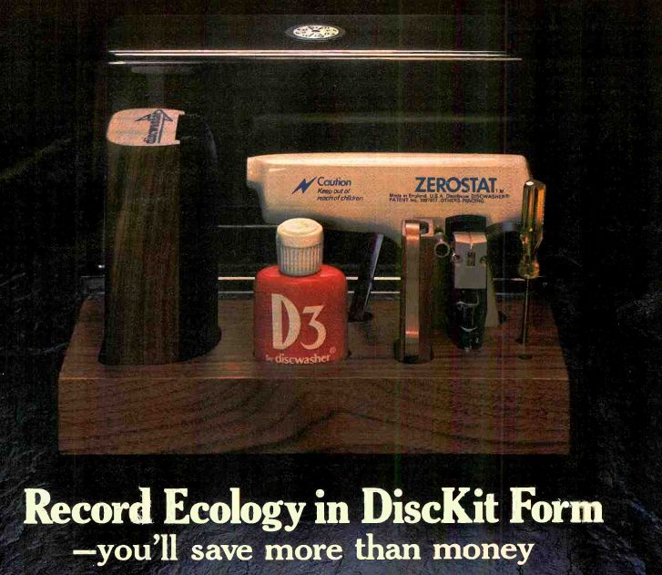 ------------- Record Ecology in DiscKit Form you'll save more than money DiscKit is a milled walnut tray and dust cover that saves you 15% with the Discwasher products in the kit. ($46 versus $54 separately) DiscKit includes:1) The Discwasher Sys tem Record Cleaner with D3 Fluid, 2) the Zerostat anti-static pistol and test light, and 3) the SC-1 Stylus Cleaner. But you'll save more than money. You'll save your records from imbedded micro dust, your cartridge stylus from abrasion and your ears from a lot of static. Record Ecology from Disc washer-a substantial bargain. (Walnut tray and dust cover are avail able separately as the Discorganizer, $12.50.) All from Discwasher, Inc., 1407 N. Providence Rd., Columbia, Missouri 65201.