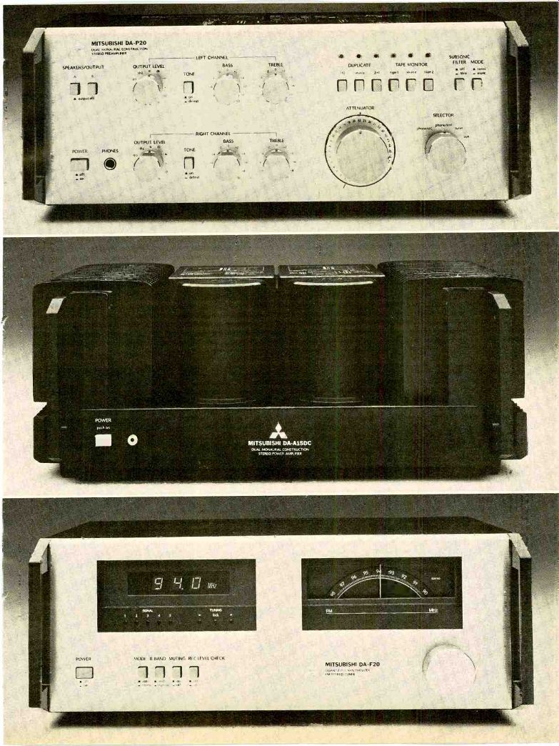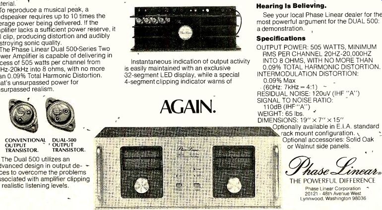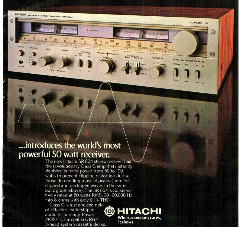 HITACHI ![]() The New Leader In Audio Technology ...introduces the world's most powerful 50 watt receiver. The new Hitachi SR 804 stereo receiver has the revolutionary Class G amp that instantly doubles its rated power from 50 to 100 watts to prevent clipping distortion during those demanding musical peaks (note the clipped and unclipped waves in the, symbolic graph above). The SR 804 is conservatively rated at 50 watts RMS, 20-20,000 Hz into 8 ohms with only 0.1% THD. Class G is just one example of Hitachi's leadership in audio technology. Power MOS/FET amplifiers, RAP When a company cares, it shows. 3-head system cassette decks, Uni-torque turntable motors, and gathered-edge metal cone speakers are just some of the others. There's a lot more. Ask your Hitachi dealer. Nakamichi ![]() Imagine encountering a stereo receiver light-years ahead in styling, operation and performance. You've never seen anything quite like it before its timeless elegance immediately commands your attention. You extend your hand. An effortless touch brings the entire system to life. There are no buttons to push, levers to flip, nor knobs to turn. The receiver, instead, responds to your every command at the briefest touch of its fingertip sensors. Its awesome performance, finally, leads you to conclude that it is the product of an infinitely advanced intelligence. You'd be surprised, then, to learn that the 730 Receiver is available on earth at a Nakamichi dealer. You owe it to yourself to see, hear and, most importantly, touch the Nakamichi 730 ... especially if you are totally satisfied with your present stereo system. Write for more information: 220 Westbury Avenue, Carle Place, New York, 11514, usa. Nakamichi Products of unusual creativity and competence... ![]() Until the Sound Guard record care work pad, one side of your record could take a beating while you were caring for the other. A paper towel that could scratch. A piece of velvet that slips. A cloth of any kind that leaves telltale lint. Until now, that's all you've had to lay your record on when you wiped, sprayed or buffed it. Now you've got some--The pad protects one side of your record while you're working on the other The pad holds the record gently in place for buffing or wiping. thing that takes care of one side of your record while you're working on the other side. It's non-conductive to resist picking up particles from dirty records. It's not a fabric, so it has no lint to spread around. And it's non abrasive to avoid scratching and slipping when you're buffing. Its ingenious channels give you another advantage. They collect any excess fluid so it won't run over to the other side of your record-or onto your furniture. Wash off your record care work pad, when you have to. Use it as you're meant to, and your records will never take another beating. Like all Sound Guard products, the Sound Guard record care work pad is sold in audio and record outlets. Sound Guard keeps your good sound. Sound Guards preservative-Sound Guard- cleaner-Sound Guard Total Record Care System-Sound Guard record care work pad Sound Guard is Ball Corporation's registered trademark. Copyright Ball Corporation, 1978. Muncie, IN, 47302 USA LUX ![]() We're rather well-known for our expensive amplifiers and tuners. Now we'd like to be known for our less expensive ones. When LUX Audio products were introduced to the U.S. in late 1975, we had already played a leading role in Japan electronics for more than five decades. And our audio components had enjoyed an enthusiastic following in Asia and Europe for many years. Thus, unlike the typical "new" brand, LUX had available a wide array of integrated and power amplifiers, preamplifiers and tuners. Eighteen models in all. Our problem was deciding which to introduce first. We chose our top of the line power amplifier, the M-6000. Its enthusiastic reception encouraged us to follow with our other state-of-the-art products, such as the L-100 integrated amplifier and the C-1000 preamplifier. These superb components combined performance, styling and precision in a manner new to the U.S. audiophile. They prompted one audio publication to state: "Almost overnight, the name 'LUX Audio' has earned itself a place of Luxman T-88V AM/FM stereo tuner. Our least expensive tuner, yet includes FET front end with four-section tuning capacitor. Linear-phase ceramic filters in IF section. Features include FM interstation-noise muting, variable output level control and oscilloscope jacks for viewing multipath distortion, etc. Usable FM sensitivity; 2 microvolts (11.2 dBf) IHF and 2.8 microvolts (14.1 dBf) for 50 dB quieting. Stereo separation: 43 dB at 1,000 Hz. $345.00 respect in the hi-fi marketplace." That was fine. Not so fine, however, was our resulting reputation for being very expensive. Thus, many audiophiles were deprived of enjoying LUX quality and performance simply because they were unaware of our less expensive products. We're now rectifying that. The units shown below are representative of our more moderately priced components. The differences between them and our top models are more a matter of power or flexibility than any variation in quality. You'll see that even our lowest priced units have specifications any manufacturer of fine components would be proud of. So, if some of the engineering "indulgences" of our top units aren't really necessary to you, you can still enjoy the sonic excellence that distinguishes LUX components... because now you know about our moderate-priced components. Your LUX Audio dealer will be happy to spend as much time as you need helping you to appreciate them. Luxman L-80V integrated stereo amplifier. 50 watts minimum continuous power per channel, with total harmonic distortion no more than 0.08 per cent, both channels driven simultaneously into 8 ohms, 20 to 20,000 Hz. Frequency response, 10-50,000 Hz, within 1 dB. Phono Sill better than 77 dB (re: 10 mV input). Bass and treble controls each have 3 turnover