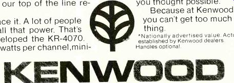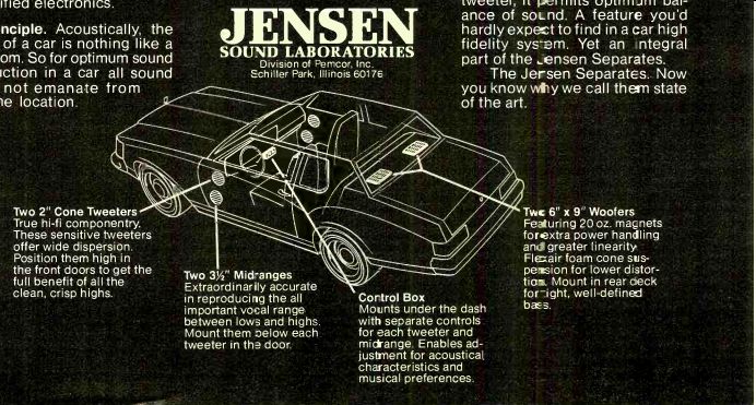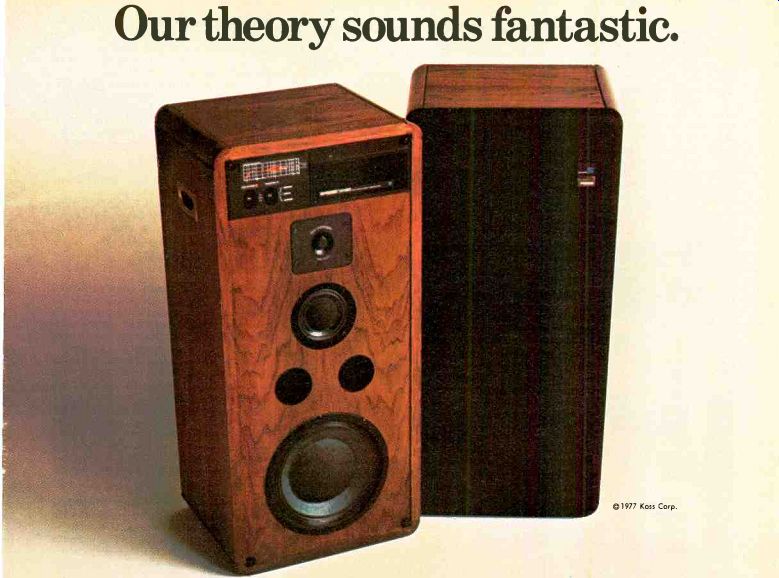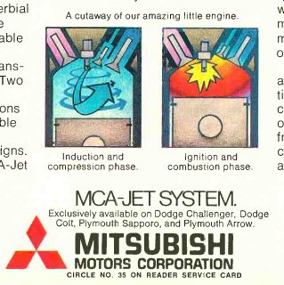 ------Two 6" x 9" Woofers Featuring 20 oz. magnets for extra power handling and greater linearity Flair foam cone suspension for lower distortion. Mount in rear deck for tight, well-defined bass. ![]() Introducing our two-barrel, four-cylinder, twelve-valve, smooth-running, low-emissions wonder. If you're really into cars and driving, you should know more about our amazing new MCA-Jet System with Silent Shaft. We think it's one of the most significant engine developments to come down the pike since the first American high-compression V8. First off, it offers all the advantages of a four-cylinder engine... but without the vibration usually associated with the proverbial "four-banger." Its unique Silent Shaft design (available only with the five-speed manual and automatic trans missions) is the reason. Two counterbalancing shafts rotate in opposite directions to cancel out the noticeable power pulses inherent in normal four-cylinder designs. Now comes the MCA-Jet A cutaway of our a Induction and compression phase. Amazing little engine, part of our system. MCA stands for Mitsubishi Clean Air. The MCA-Jet System meets...even exceeds...the stringent emissions requirements now in effect in both Japan and America. Without loss in performance, too. A revolutionary new cylinder-head design that incorporates a third, or "jet," valve does the job. This valve introduces an extra swirl of air into the combustion chamber which swirls the fuel-air mixture and promotes a faster, more even, thorough burning of the mixture at ignition. The MCA-Jet System. It's a simple, yet highly sophisticated, answer to a very complex problem. The kind of answer you would expect from people who care about cars and driving as much combustion phase. as you do. Ignition and MCA-JET SYSTEM. Exclusively available on Dodge Challenger, Dodge Colt, Plymouth Sapporo, and Plymouth Arrow. MITSUBISHI MOTORS CORPORATION ![]() Koss![]() Our theory sounds fantastic. In an industry where trial and error methods are common, the Koss Theory of loudspeaker design may seem out of place. But once you hear the unmatched Sound of Koss in the new CM 1020 loudspeaker, you'll know our computerized theory helped make the optimum 3 bandpass speaker a reality. The Koss Theory eliminates the guesswork in speaker design by selecting parameters for the best possible performance. That's why every part of the CM 1020 works superbly both alone and as part of the whole. The dual ports, for example, enhance the woofer's front sound waves and dampen excessive woofer movement. There are two ports instead of one because two allow for improved cabinet tuning and greater structural stability. This added stability keeps the cabinet walls from beginning to flex causing unwanted sound waves. The port-augmented 10-inch woofer is a special design that provides a 3 dB gain in electrical efficiency and a 3 dB down point of 31 Hz while offering maximally flat response over the low bandpass. To capture all the presence and musical energy from 300 Hz to 3.5 kHz, the CM 1020 features a performance synthesized-inch midrange driver. Handling the high bandpass is a 1-inch dome tweeter linked to a unique acoustic transformer. This Koss tweeter produces the highest energy output and lowest distortion of any 1-inch direct radiator tweeter on the market. Finally, to unite all these outstanding elements, Koss developed a unique, seamless crossover network. Though we've tried to describe the superiority of the Koss CM 1020, nothing can match the thrill of a live performance. Ask your Audio Dealer for a demonstration, or write to Fred Forbes c/o the Koss Corporation for a free brochure of Koss CM loudspeakers. After experiencing the CM 1020, you'll agree: hearing is believing. KOSS CM 1020 SPEAKER SYSTEM---hearing is believing KOSS CORPORATION, 4129 N. Port Washington Aye.. Milwaukee, Wisconsin 53212 Koss . 51977 Koss Corp International--- London, Dublin. Paris, Frankfurt Amsterdam Koss Limited/ Ontario Koss K. .' Tokyo