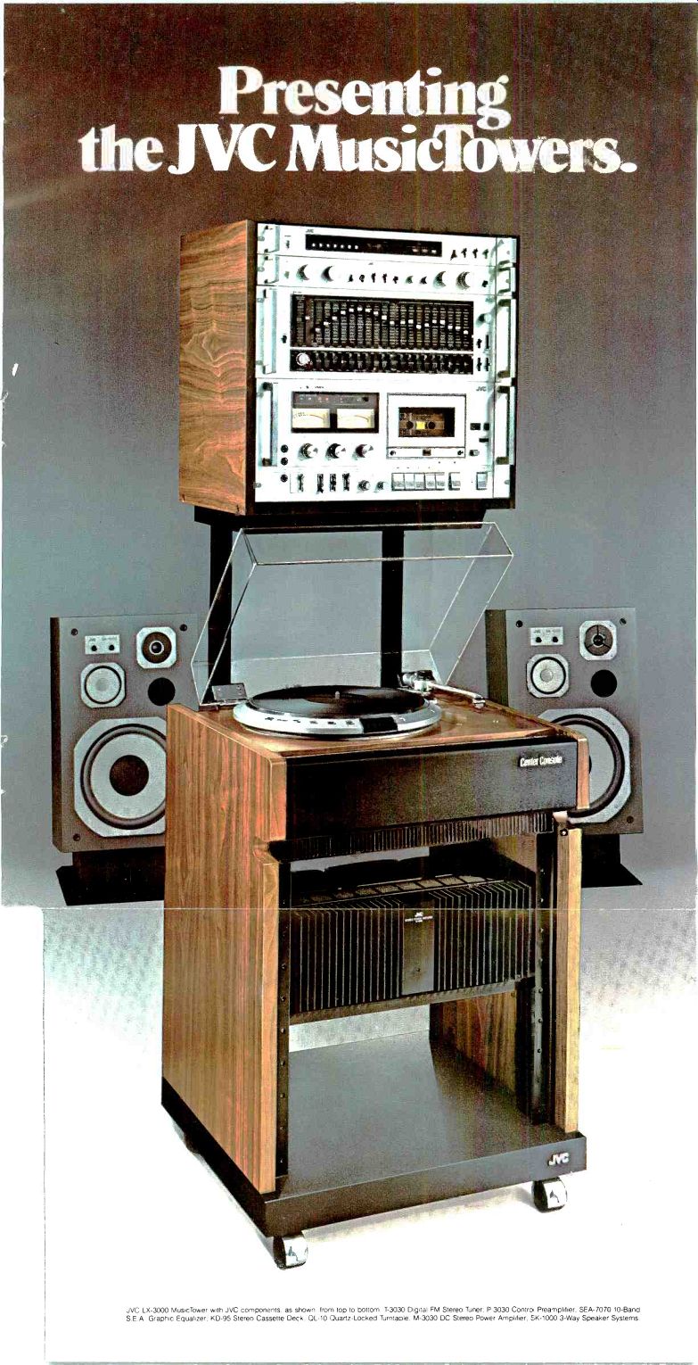 JVC LX-3000 Music Tower with JVC components. as shown, from top to bottom. 1-3030 Digital FM Stereo Tuner: P-3030 Control Preamplifier; SEA-7070 10-Band S.E.A Graphic Equalizer, KD-95 Stereo Cassette Deck, QL-10 Quartz-Locked Turntable. M-3030 DC Stereo Power Amplifier, SK-1000 3-Way Speaker Systems. ![]() As you can see from the suggested JVC systems shown, your choice of components and MusicTowers depends on your own special requirements and budget. And regardless of which combination you select, one thing you can be certain of: all JVC components are designed to complement each other to produce the best possible sound reproduction. So if you agree that a good music system should be heard-and seen-visit your JVC dealer. Select your JVC system from the most innovative collection of quality components we've ever offered. Then match it up with a JVC MusicTower. And you'll see how beautifully JVC lends a hand to component handlers. JVC LK-12 MusicTower (from top to bottom) JL-A20 Semi-Automatic Turntable. JR-S61W AM/FM Stereo Receiver: KD-25 Stereo Cassette Deck JVC LX-2000 MusicTower (from top to bottom) JT-V77 AM/FM Stereo Tuner; JA-S77 DC Integrated Stereo Amplifier: QL-A7 Direct Drive Quartz Turntable with automatic-lift: KD-85 Stereo Cassette Deck; SEA-50 Stereo Graphic Equalizer JVC LK-1000 MusicTower (from top to bottom) QL-5 Direct Drive Quartz Turntable: JT-V22 AM/FM Stereo Tuner: JA-S55 DC Integrated Stereo Amplifier: KD-55 Stereo Cassette Deck; SEA-50 Stereo Graphic Equalizer. Protective glass door for components and record compartment. JVC LK-44/MK-44 MusicTower (from top to bottom) QL-A2 Direct Drive Quartz Turntable with automatic return; JT-V22 AM/FM Stereo Tuner; JA-S22 DC Integrated Stereo Amplifier; KD-25 Stereo Cassette Deck: SEA-20G Stereo Graphic Equalizer. Glass paneled record compartment. JVC LK-500 Horizontal MusicTower-QL-5 Direct Drive Quartz Turntable. KD-S201 Stereo Cassette Deck; JR-S301 DC Integrated AM/FM Stereo Receiver. SK-700 3-Way Speaker Systems. Extra-wide record compartment. JVC----JVC America Company. Division of US JVC Corp . 5875 Queens Midtown Expressway. Maspeth, N Y. 11378 (212) 476-8300 Canada JVC Electronics of Canada. Ltd.. Scarborough. Ont Because we think a good music system should be heard, And seen. People who are into good music reproduction are proud of their high fidelity component system. They like to put where everyone can see as well as hear it. And rightfully so, because visually, todays components are a tribute to the finest expression of contemporary design. That's why JVC is introducing its series of Music-towers. They’re br people who like to display their JVC component system in one place. Or any place. To meet just about any requirement for a JVC component system, our handsomely styled Mus give you the opportunity to select the JVC components you want: anything from a basic system (receiver, turntable, cassette deck, speakers) to one that accommodates a total system of separate components Take ourLX-3000 MusicTower This strikingly styled unit with gleaming walnut veneer sides, is designed for nineteen-inch rack-mounted components, and can house JVC's Professional Series. Each component represents the finest JVC offers. And the great thing is that it's easier than ever to make the proper interconnections after each component slides securely into place. Then, because JVC believes distractions belong in the back, not the front, all interconnecting wires vanish from sight within each of the two vertical supports. You can even move the whole works from one listening area to another; the LX-3000 Music-Tower glides smoothly over any floor surface on heavy duty casters that lock into place. This JVC MusicTower takes the center spotlight in any listening room.