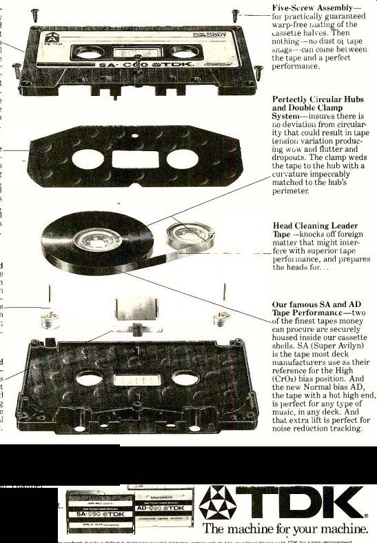 The one alternative to separates: The Yamaha CA-2010 Integrated Amplifier. ![]() ![]() The Head Amplifier. Discerning music lovers all over the world are discovering the transparent highs and extended frequency response of the moving coil phono cartridge. While other manufacturers require the addition of an expensive preamp or step-up transformer to boost the low output signal, Yamaha included a special head amplifier in the CA-2010. It's available with the flip of a switch on the front panel. And to help you get the most out of moving magnet cartridges, there's a 3-position phono impedance selector. The Preamplifier. To assure exact, repeatable bass and treble settings, the controls are precision calibrated in ½ dB steps. Dual turnover frequencies for both ranges double the versatility of these accurate tone controls. Completely independent Input and Output Selectors let you record one source while listening to another. And the power meters are easily switched to REC OUT readings in millivolts, so you can monitor the actual output level to your tape deck for cleaner, distortion-free recordings. The Power Amplifier. 120 watts RMS, with no more than 0.03% THD 20Hz to 20, 000Hz into eight ohms. For tighter, cleaner bass response, the amplifier can be switched to DC operation. Class A operation is switchable on the front panel, delivering 30 watts RMS, with no more than 0.005% THD 20Hz to 20, 000Hz into eight ohms. The twin power meters are fast-rise, peak delay-they can track even the briefest of transient bursts. Plus they can respond to levels from 1mW to 316W (into eight ohms). Real Life Rated! The specifications of the individual components of the CA-2010 are superior to many separates. Individual specifications alone, however, can't possibly reflect actual in-system performance. That's why Yamaha measures overall performance from phono in to speaker out, rather than at designated points along the signal path. Furthermore, we measure noise and distortion together over a broad output range, rather than individually at the optimum output. Our Real Life Rated measurement is called Noise-Distortion Clearance Range (NDCR). On the CA-2010, NDCR assures no more than 0.1% combined noise and distortion from 20Hz to 20kHz at any power output from 1/10th watt to full-rated power. ![]() Superb tonality from a musical tradition of technical excellence. The tonal accuracy of our audio components is referenced to the same standards used to evaluate the tonal accuracy of our world-renowned musical instruments. The result is a rich, clear tonality that is unknown elsewhere. You really must hear it. You really must hear the same resolutely accurate music reproduction available from all four Yamaha Integrated Amplifiers and four superb tuners. All are made to a single standard of excellence--a standard rooted in a 90-year tradition of musical perfection. For a personal audition of the new Yamaha CA-2010, as well as the rest of our complete line of components, just visit your nearest Yamaha Audio Specialty Dealer. If he's not listed in your Yellow Pages, drop us a line. YAMAHA Audio Division, P.O. Box 6600, Buena Park, CA 90622 TDK Electronics Corp.![]() To get a superb performance, you need a precision machine. To command a great performance, a cassette shell and cassette tape must be engineered to the most rigorous standards. Which explains why we get so finicky about details. Consider: Precision Molded Cassette Shells--are made by continuously monitored injection molding that virtually assures mirror-image parallel match. That's insurance against signal overlap or channel loss in record or playback from A to B sides. Further insurance: high impact styrene that resists temperature extremes and sudden stress. An Ingenious Bubble Surface Liner Sheet commands the tape to follow a consistent running angle with gentle, fingertip-embossed cushions. Costly lubricants forestall drag, shedding, friction, edge-wear, and annoying squeal. Checks channel loss and dropouts. Tapered, Flanged Rollers--direct the tape from the hubs and program it against any up and down movement on its path to wards the heads. Stainless steel pins minimize friction and avert wow and flutter, channel loss. Resilient Pressure Pad and Holding System spring-mounted felt helps maintain tape contact at dead center on the head gap. Elegant interlocking pins moor the spring to the shell, and resist lateral slipping. TDK Cassettes--despite all we put into them, we don't ask you to put out a lot for them. Visit your TDK dealer and discover how inexpensive it is to fight dropouts, level variation, channel loss, jamming, and other problems that interfere with musical enjoyment. Our full lifetime warranty is your assurance that our machine is the I Five-Screw Assembly-, foi pi actually guaranteed warp-free mating of the cassette halves. Then nothing-no dust of tape snags--can come between the tape and a perfect performance. Perfectly Circular Hubs and Double Clamp System--insures there is no deviation from circularity that could result in tape tension variation producing wow and flutter and dropouts. The clamp weds the tape to the hub with a curvature impeccably matched to the hub's perimeter. Head Cleaning Leader Tape--knocks off foreign matter that might interfere with superior tape performance, and prepares the heads for.. , Our famous SA and AD Tape Performance-two of the finest tapes money can procure are securely housed inside our cassette shells. SA (Super Avilyn) is the tape most deck manufacturers use as their reference for the High (CrO2) bias position. And the new Normal bias AD, the tape with a hot high end, is perfect for any type of music, in any deck. And that extra lift is perfect for noise reduction tracking. machine for your machine. TDK Electronics Corp., Garden City, N.Y. 11530. Canada: Superior Electronics Ind., Ltd. The machine for your machine. In the unlikely event that any TDK cassette ever tails to perform due to a defect 