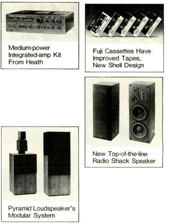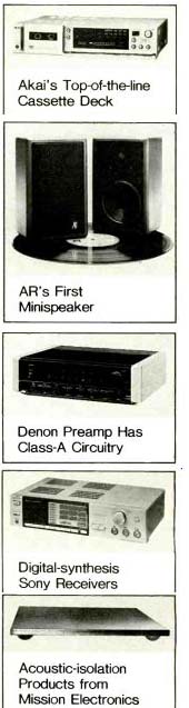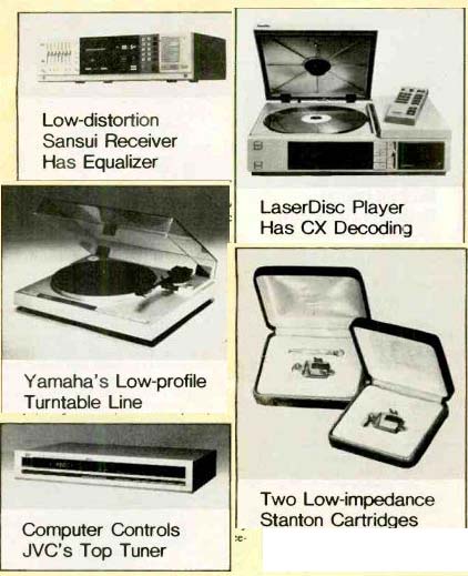 Low-distortion Sansui Receiver Has Equalizer The "Super-Feedforward" DC power-amplifier section in Sansui's Z-9000 microprocessor-controlled receiver is said to re duce all forms of steady-state and dynamic distortions. The unit is rated at 120 watts per channel from 5 to 100,000 Hz with total harmonic distortion of less than 0.005 percent. The preamplifier section includes a pre-preamp for moving-coil cartridges. Signal-to-noise ratio (S/N) of the moving-magnet phono section is 82 dB. The Z-9000 has a digital-synthesis tuner section with a S/N rated better than 80 dB. Usable sensitivity is better than 10.3 dBf, and distortion is under 0.05 percent. Sixteen presets are available ( eight AM, eight FM) as well as a choice of automatic or manual tuning and narrow or wide i.f. bandwidth. The built-in graphic equalizer is a seven-band model with a reverberation amplifier and adjustable 0-to 3-second echo decay. Other features include fluorescent peak-power meters, switching for three pairs of loudspeakers and two tape recorders, microphone mixing, a station-frequency display that doubles as a digital clock, and a three-memory program timer. Price: $950. ![]() Two Low-impedance Stanton Cartridges Stanton's new 885LZS (left) and 785LZE (right) low-impedance, low-output moving-magnet phono cartridges both in corporate a samarium-cobalt magnet attached to a specially developed cantilever whose material permits maximum stiffness with minimum moving mass. The 885LZS is designed for a tracking force of 3/4 to 1 1/2 grams and has a large-contact-area Stereohedron stylus. Output is 0.06 millivolt per cm/sec of recorded velocity. Frequency response extends from 20 to 40,000 Hz. Channel separation is given as 35 dB, cartridge inductance as I millihenry, resistance as 3 ohms. The recommended load impedance is 100 ohms or higher. Designed to track at the same force as the 885LZS, the 785LZE has a 0.2 x 0.7-mil elliptical stylus and a 30-dB separation specification. Both cartridges weigh 5.5 grams, come with a Stanton long-hair record brush, and have user-replaceable styli. Prices: 885LZS, $150; 785LZE, $100. LaserDisc Player Has CX Decoding Pioneer Video's top-of-the-line LD-1100 laser-optical videodisc player includes a CX noise-reduction / dynamic-range-expansion system for use with CX-encoded videodiscs. Properly decoded, such discs are said to offer an audio signal-to-noise ratio greater than 70 dB and a frequency-response range of 40 to 20,000 Hz. The LD-1100 comes with a handheld infrared remote-control unit for audio switching, random access to individual videodisc chapters or frames, scanning, fast forward or reverse at three times normal speed, slow motion, and step- and freeze-frame display. It also has pause and play controls and a reject switch for changing videodiscs. The front panel of the player duplicates most of the controls on the remote unit. It also has the power switch, a CX on/off switch, and a variable-speed control for the slow-motion mode. Audio-output connections are made with stereo phono jacks on the rear panel. Both r.f. and NTSC video outputs are provided. Dimensions are 20 3/8 x 5 5/8 x 15 3/4 inches. Price: $800. Pioneer Video, Inc., Dept. SR, 200 West Grand Avenue, Montvale, N.J. 07645. Yamaha's Low-profile Turntable Line Yamaha's new P-200, P-300, P-500, and P-700 turntables all feature low-profile styling, smoked-plastic dust covers, and improved versions of Yamaha's "Optimum Mass, Minimum Resonance" straight tone arm. The tone arm has been simplified and modified for a damped resonance frequency designed to fall near 12 Hz with most phono cartridges. The P-200 is a belt-drive semi-automatic unit, the P-300 a direct-drive semi-automatic model, and the P-500 a direct-drive fully automatic turntable. The P-700 (shown) has a quartz-regulated-PLL direct-drive mechanism, fully automatic operation, light-touch front-panel controls, and two lightweight headshells. Wow-and-flutter is given as 0.015 percent (wrms); signal-to-noise ratio is 78 dB. Weight is 13 1/4 pounds. Dimensions of all four new models are 17 1/4 x 4 3/8 x 14 7/8 inches. Prices: P-200, $150; P-300, $190; P-500, $220; P 700, $270. Computer Controls JVC's Top Tuner The T-X55 quartz-locked digital-synthesis AM/FM stereo tuner from JVC features automatic computer-controlled optimization of reception and newly developed circuitry for improved performance. When tuning in a station, the built-in microcomputer measures the signal strengths of the desired station and of adjacent stations that might interfere with reception. It then adjusts antenna attenuators, i.f. bandwidth, and stereo blend for best reception. The circuitry includes a gallium-arsenide field effect-transistor (FET) mixer for reduced station cross-modulation, a high-Q varicap in the front end for improved selectivity, a non-multiplexed drive of the front-panel display for lower noise, and a new quadrature detector and balanced AM mixer. Other features of the T-X55 include eight FM and eight AM station presets, an AM sensitivity switch for improved AM reception, a recording calibration-tone switch, manual override of the computer-set parameters, a digital r.f. field-strength display (which doubles as the station-frequency indicator), a six-broadcast programmable-timer recording function that makes possible the sequential recording of different stations, and a detachable AM loop antenna. FM specifications include a mono usable sensitivity of 10.3 dBf (0.9 microvolt, or µV) and a 50-dB-quieting sensitivity of 31 dBf (9.8 µV) in stereo. The A-weighted stereo signal-to-noise ratio with short-circuited antenna terminals is 80 dB. At 1,000 Hz, total harmonic distortion in stereo is 0.07 percent. Alternate-channel selectivity and image-response ratio are both 80 dB. Capture ratio is 1 dB and stereo separation at 1,000 Hz is 50 dB. Frequency response is given as 30 to 15,000 Hz +0.3,-0.8 dB. In AM, usable sensitivity is 20 µV with an external antenna, total h