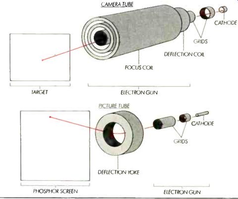 by David Ranada ![]() Camera and Picture Tubes EXCEPT for a few high-end cultists, audio has abandoned the vacuum-tube technology that gave it birth. But in video the tube still reigns supreme; a vacuum tube is at the heart of nearly every video cam era and television or monitor screen. Scanning may be the core of video theory, but cathode-ray tubes are the foundation of video practice. A basic understanding of how they apply the principle of scanning to image transmission should be part of every videophile’s education. Despite their locations at opposite ends of the video chain, camera tubes and picture tubes are both cathode-ray tubes and are based on the principle of the electron gun (see illustration). In an electron gun, negatively charged electrons are "boiled" off a heated metal plate (the cathode), then pulled-not shot-toward the front of the tube by means of very strong electrostatic fields (the same kind of fields that create sparks between your fingers and doorknobs on dry days). The fields are created by the application of very high positive volt ages to some of the tubes' internal parts. For example, the highest volt age in a picture tube occurs right at the phosphor screen; a large-screen color tube can have a charge of 30,000 volts-internally. The specially shaped electron-accelerating structures, called "grids," also serve as electrostatic lenses to focus the otherwise chaotically drifting electrons into a very tight beam, or a "cathode ray." The direction of electrons moving in a vacuum can be changed by magnetic fields in addition to electrostatic fields, and camera-tube electron beams are usually focused by means of magnetic fields. The magnetic fields are generated by coils surrounding the actual vacuum-tube portion of a camera tube. With both types of tubes, electro magnetic coils are responsible for steering the beam in the required interlaced scanning pattern. About half the circuitry in a camera or monitor is devoted to generating the vertical and horizontal sweep signals that drive these deflection coils. Picture-tube coils are mounted in a simple-looking assembly called a deflection yoke, the design and alignment of which is critical for picture quality, though it rarely receives attention in ads. It's in what happens at the business end of the electron beam that the major differences between cam era and picture tubes really show up. In a camera, the beam hits a photosensitive target, on the other side of which has been focused the original optical image. The target is photoconductive; its electrical resistance at any point on its inner surface varies in proportion to the amount of light hitting its outer surface. Therefore, an electron beam sweeping over the target generates a varying voltage in the tube-output circuits. This voltage is proportion al to the light intensity on the target at the location of the beam, which is how the optical image is transduced into an electrical signal. In contrast to the camera tube's photosensitive target, the inner front surface of a picture tube is coated with chemicals called phosphors that glow when struck by high-energy electrons. As the electron beam from the back of the tube sweeps over the phosphor coating, it produces a glowing spot. The intensity of the glow depends on the intensity of the beam. That intensity is controlled by the first grid the electrons pass on their way to the screen, and that grid is fed a signal originally generated by an electron beam in a camera tube. As the electron beam sweeps out its raster, an electrical signal is transformed back into an image. For a concrete demonstration of part of this process, try this experiment to determine which end or side of a magnet is its north pole. Simply hold the magnet up close to a monochrome picture tube while the set is on (do not do this experiment with a color set unless you know how to degauss a picture tube). The picture around the mag net will warp as the magnet's field deflects the electron beam. Areas where the picture twists clockwise are near the magnet's north (more properly, north-seeking) pole; counterclockwise warpage indicates the south pole. There are simpler ways to earn a merit badge in magnetics, but they aren't as high-tech! ![]() ======== Also see: Source: Stereo Review (USA magazine) |