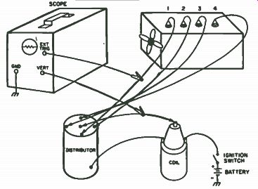 Build an Engine Analyzer If you are anything like most hobbyists, you hate to pay someone else to do something you can do yourself. That's the way it is with many experimenters and their automobiles. They are self-professed experts, yet have no way of taking on the complexities of the common Kettering automobile ignition system. For this project, get your hands on an automotive timing light. It has a bright flash and operates from the car battery system. Hook it up to your car. The instructions say to hook the red and black wires on the light to the positive and negative terminals of the car battery and then clamp the induction pickup around the number one spark plug wire. Elementary, so far. With the engine running, and being careful to watch that those dangling wires don't drop into the spinning fan blades, gently squeeze the trigger on the gun and watch the light spring to life. One hobbyist tried this and since he had fiddled around some with automotive problems and knew that the timing marks are found on the side of the front pulley he figured that all that had to be done was to rub some chalk into those marks. Then you can see them easily, and, with the timing light aimed at the spinning pulley,, press the trigger and watch the strobing action as the number one cylinder fires the timing light. However, he did overlook a few small details. The vacuum advance line to the distributor must be pulled and plugged according to the manufacturer's directions. Also, "Timing must be adjusted with the engine running at manufacturer's specified rpm. If necessary, use a tachometer to set idle rpm." Not having a tachometer, the first thought that went through this hobbyist's mind was to run out and buy one. Somehow that didn't settle too well with him. He needed to figure how many revolutions per minute his little Pinto engine was turning over however, and with a fair degree of accuracy. We've all seen the modern, automotive electronics shops, with their big engine analyzer scopes all nicely calibrated, but who among us is going to rush out and buy one of those! What this hobbyist did have was a pretty fair B and K model 1461, 10 MHz, triggered oscilloscope, with 18 calibrated sweep ranges. The problem was interesting. He began by thinking in terms of how the combustion engine works. It takes a fuel/air mixture into the cylinder on a downstroke, compresses it on the up-stoke, where it begins burning the mixture by sparking the plug somewhere before top dead center. The resultant explosion gives the power downstroke. Finally, the cylinder on the last upstroke exhausts the by-products of burning. The problem is to fire the plug at just the correct time on the first upstroke before top dead center and do this timing with the engine running at a specified number of revolutions per minute. The timing light flashing on the timing marks will show the answer to the first problem, but that rpm problem must still be figured out. Remember, that cylinder fires only once for every two engine revolutions. What we must do is get a good, stationary display of all cylinders firing on the scope, so we can measure the duration of all cylinder firings in time. With an externally triggered scope, this is a cinch. Take a clip lead and loosely couple it around the number one spark plug wire. Just use an ordinary clip lead with an alligator clip on one end. Clipping this around the plug wire gives plenty of induced pulses to easily trigger the scope. Switching to external trigger, the scope will now make one sweep, from left to right across the tube, for every firing of that number one cylinder. Then, by coupling the vertical input of the scope to the high tension lead coming out of the center of the distributor in the same manner, your display will show the firings of all cylinders in exactly the sequence they actually are firing. In the case of the Pinto, it will be, first, number one cylinder, followed by three, four, and finally, number two. It's a simple matter to immediately see if all plugs are firing, and also to see the relative amplitude of the spark voltage to each cylinder. The vertical gain control, along with the vertical positioning control, can be used to bring the voltage peaks of all firings onto the scope face. Just remember, we are only looking at induced voltage through the insulation of the spark plug wire. We have not connected our scope directly to any bare wire, as the plug wires can carry well over 10,000 volts of AC. In some cases, it may help to put a 2200 ohm resistor and . 05 capacitor across the input of your scope to dampen out much of the high frequency information we are not interested in. Some experimentation is called for with the exact values. Nothing is very critical in this department. Time in seconds is the reciprocal of frequency in Hertz, and frequency in Hertz is the reciprocal of time in seconds.