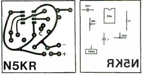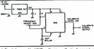The solution to all these problems is the circuit shown in Fig. 11-2, which generates a stable wave calibration signal and costs less than $3 to build. The component values shown have been selected to provide a sym metrical 1-volt p-p signal at 1000 Hz when the two trimpots are calibrated. The 555 timer generates the signal at a stable frequency, while the 7805 regulator ensures a fixed amplitude. The entire circuit contains only seven components, which are mounted on a small PC board as shown in Fig. 11-3. The 1v p-p signal enables fast and simple calibration of the scope in the vertical (amplitude) axis, and the 1000 Hz frequency is a nice round reference frequency for analysis of most audio signals. The circuit board is small enough to mount inside of the oscilloscope itself, with the few milliamps of power required being supplied from the scope's existing power supply. Construction. The circuit is simple enough to build on perfboard, and parts layout is not critical. It can be built on a small PC board, the layout for which is shown in Fig. 11-4. Parts placement, as viewed from the component side, is given in Fig. 11-5. Component tolerances of 20 percent are satisfactory, since the two trimpots are used to make the final amplitude and frequency adjustments. In fact; the . 027 ¡ if capacitor can be substituted with any value from . 02 to 0.047, if you don't have a 0.027. But it would be better to go lower in value rather than higher, if you have a choice. The important thing is that this capacitor be of mylar or other temperature-stable type. The PC layout shown in Fig. 11-4 has two different solder pads (one on an extension) on the ground side of this capacitor to accommodate whatever capacitor you select, since its physical size may be different from the one used here. There are also a couple of extra solder pads for making an external ground connection, if desired. The 7805 regulator may be substituted for an LM340T-5, which is the same device. On rare occasions, these regulators have been known to go into self-oscillation. Should you encounter this problem, replacing the 0.1 uF disc capacitor with a le tantalum capacitor should clear it up. Mounting and Power Connections. The circuit is so small that it can be mounted almost anywhere in the scope. In fact, you can trim the PC board down a lot smaller than the one shown in Fig. 11-3, which has a lot of blank space around the edges. You should, however, make it a point to mount it as far as possible from major heat sources so that the calibrator's frequency stability won't be impaired. The input voltage can be anywhere from +9 to +30 volts DC, and you won't have any trouble finding a supply voltage somewhere in this range in a solid state oscilloscope. If your scope is tube type, you might still find a