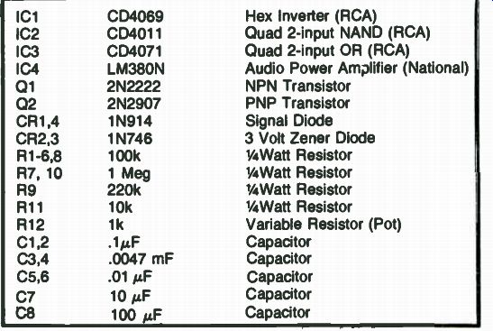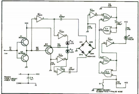 ------------------ IC1 -SN7404 IC IC2 -SN7400 IC QI, Q3 -2N3904 transistor Q2 2N3906 transistor CR1, 2, 3, 4 -1N914 diode R1 -1k 1/4 Watt resistor R2 -10k 1/4 Watt resistor R3-9 -470 Ohm 1/4 Watt resistors Cl, C2 -200 pF capacitor C3 -120 elf capacitor (2 small 60 MF inparallel) C4 -. 1 1.4.F disc capacitor LED 1-3 -Any type/color LED desired Table 11-1. Parts List ![]() --------------------- ... multiplexer is functionally identical, but not pin compatible, with the 9312 unit. The LM311 comes in either a mini-dip or TO-5 package. As the pin-outs are identical, either may be used with the circuit board shown (Fig. 11-8). Using your multitrace scope is a delightful experience: You see all of those signals at the same time, and can really tell what is going on. Re member that you must trigger the sweep from the slowest signal you are viewing. Otherwise, you will not be able to sync the slower signals. Also, be aware that the inputs are not protected in any way, and connection to potentials outside of the proper logic levels will destroy the multiplexer IC. Protective diodes may be added on the input lines to give marginal security, but care, plus a socket for the 9312, are probably adequate. The small investment required to construct this unit will be quickly repaid the first time you use it to track down a problem. Superprobe If the modern technician is going to be successful when working with digital logic, he must have means of looking inside the circuit. The most common way in the industry is with the use of an oscilloscope or logic analyzer. Both of these instruments are great, but the cost puts them out of reach for most experimenters. The Superprobe ( Fig. 11-9) was designed to be an inexpensive piece of test gear which will provide the necessary insight into the digital circuit under test. This probe is not a toy, and will provide the user with almost as much information as a $3,000 oscilloscope, when dealing with TTL or DTL logic. The probe has several desirable features, aside from the expected "1" and "0" indication. The first is a pulse stretcher, and pulse memory. Any time a high to low or low to high transition takes place, the pulse LED will flash. The flash will be visible even with very narrow pulses, since the probe will stretch the pulse width to a visible flash. If the probe is in the memory mode, the pulse LED will remain lit until reset by the operator, capturing any stray pulse. Another important feature is high impedance input. It will not load the circuit under test. The input is protected by the zener action of the input transistors, with current limited by R1, in the event the probe is touched to high voltage. Yet another feature of this probe is that if the tip is touched to an open circuit, or to a chain of floating inputs, no light will light, thus identifying this condition immediately. The entire circuit uses only two inexpensive TTL ICs, three transistors, and can be built into a handy, hand-held probe. The parts list is found in Table 11-1. The Audible Probe Is Safer to Use This project is a piece of test gear that gives the output in audio. The unit does not have to fit totally in the hand since it's for bench work. Therefore, creation of the sound (loudspeaker) won't be a problem. You can now build a logic probe that works with CMOS, produces a high tone for a logic high, a low tone for a logic low and no sound for an open or floating string. In addition to this, the unit will detect narrow pulses and stretch them so the user is able to hear them. The audio probe will detect high to low, or low to high pulses and will do anything any good probe will do, except its output is in sound. It works great! Circuit Description. Transistors Q1 and Q2 form the input stage (Fig. 11-10). Under no signal or floating input condition, both transistors are biased on by the base resistors. In the ON state, the collector of Q1 is near ground and the collector of Q2 is near plus volts. It is stated as "near" because of the 3 volt zeners in the emitter of each transistor. The zeners will subtract their voltage from what is developed in the collector circuit. The purpose of the zeners is to provide a threshold level at which the transistor will key. For Q1 to turn on, the base must be greater than 3.5 volts, and for Q2 to turn off, its base must be higher than supply voltage minus 3.5 volts. This choice of zener value is not critical. The choice for this project was made based on the fact that all of the cmos circuits are run from 12 volts. With this value of zener, the probe rejects any signal not below 3.5 or above 9 volts. A functioning circuit will easily exceed these values, and if it won't, the circuit is bad. From this point on, think logic. We will call the collector of Q1 "A," and the collector of Q2 "B." If the probe tip is floating, A is low and B is high. li the tip is low, A is high and B is also high. If the tip is high, A is low and B is also low. Three unique states-one for each condition. Now all that is necessary is to decode the states. Only the 1 and 0 states are decoded, since if the state is not a 1 and 0, it must be the open state and nothing happens during this state. If a high condition occurs, the 1 decoder triggers the pulse stretcher. This pulse stretcher is a bit different in that it uses an OR gate. If pin 1 goes high, pin 3 also goes high, feeding back through C1 holding pin 2, and itself high for the time determined by the time constant of C1 and R5. When Cl/R5 time out, the output of pin 3 will drop low again if there is not a high still on pin one. The gate acts like a straight piece of wire except that it will stretch a short pulse. Any time the output of pin 3 is high, it will enable the high pitch oscillator, causing a high tone to be generated.