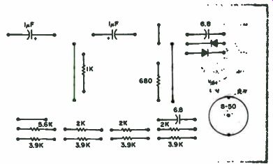 The 0 decode, pulse stretcher and oscillator work exactly the same as the circuit just described, except, of course, the tone generated is a low pitch. The two tones generated are mixed in the final section of IC3, with the inputs on pins 8 and 9, and the mixed audio on pin 10. The output at pin 10 is good for an earphone (used with a volume control) or a small speaker. You could even add a small audio amplifier if you work in a noisy environment. Of course, it could blast you out of the room. As mentioned, the unit will produce a high tone for a high and a low tone for a low. With a bit of practice, as with other types or probes, you can get a pretty good idea of what is going on by the sound. If it sounds like both tones are on, you have a square wave signal. If you have a high tone with a low tone ticking, you have a high with a low pulse, and so on. For a parts list for this project, see Table 11-2. Mod for the Heath 10-102 Scope The Heath 10-102 scope kit appears to be one of the "better buys for the money." The 30 mV vertical sensitivity, 80 nanosecond rise time, and 5 MHz frequency response seem to fill the bill. Actually, the vertical response is adequate for viewing 15 MHz or higher signals with sufficient trace height to be usable. Assembly is on four main circuit boards: vertical, horizontal, sweep and power supply. The finished unit is uncluttered, internal adjust ments are no problem and most components are easily serviced. Critical power supply voltages are zener regulated, a fact which contri butes to the operational stability after warm-up. The power transformer, which is double shielded, and circuit board layout result in a trace like those drawn in textbooks. The initial alignment and internal adjustments, although not difficult, must be performed as directed. An accurate VOM or VTVM is the only equipment needed. During this alignment, one wishes he had a screwdriver with a 10 to 1 drive. However, with a light touch, the desired results can be achieved. Heath states that vertical drift during warm-up "for the first half hour or so" is to be expected. Experience with two of these units was as follows: From a cold start at 70°F, the trace was completely off the screen for the first 10 minutes. After 10 minutes, the trace appeared at the top of the CRT and drifted downward for 35 minutes, at which time it stabilized and no further drift was noted over several hours of operation. For someone who turns on the instrument and intends to use it all day, this may not appear as a problem. You may find juggling the vertical position control inconvenient, especially if your use is on an intermittent basis. The addition of four simple heat sinks produced two improvements: • A usable trace on the screen in 3 to 4 minutes. • A completely stable trace, without touching the position control, in 12 to 15 minutes. Two heat sinks were made from aluminum and attached to the vertical output transistor heat sink tabs. The tops of these sinks, which were bent 90°, may be secured to the CRT shelf with standoff insulators or RTV --------------- ![]() Table 11-2. Parts List. IC1 CD4069 Hex Inverter ( RCA) IC2 CD4011 Quad 2-input NAND ( RCA) IC3 CD4071 Quad 2-input OR ( RCA) IC4 LM380N Audio Power Amplifier ( National) Q1 2N2222 NPN Transistor Q2 2N2907 PNP Transistor CR1,4 1N914 Signal Diode CR2,3 1N746 3 Volt Zener Diode R1-6,8 100k 1/4 Watt Resistor R7, 10 1 Meg 1/4 Watt Resistor R9 220k 1/4 Watt Resistor R11 10k 1/4 Watt Resistor R12 1k Variable Resistor (Pot) C1,2 .1uF Capacitor C3,4 .0047 mF Capacitor C5,6 .01 ALF Capacitor C7 10 uF Capacitor C8 100 uF Capacitor ----------------------------- ... cement. Two additional heat sinks, 1" by 1", were attached to the driver transistors with a small wrap-around wire. Heath incorporates a 1 volt peak to peak calibrating signal at a front panel jack. A square wave calibrating signal and incorporated circuit are used. The calibrator provides a clipped sine wave signal of 0.1v, 1v and 10v. Three pin jacks were added next to the vertical input ground jack, to bring these signals to the front panel from the circuit which was mounted on the cover of the power supply transformer using existing screws. -- Next: RF Test Equipment