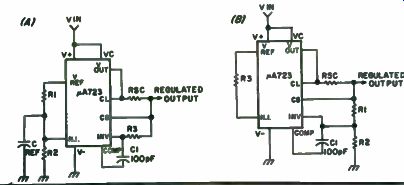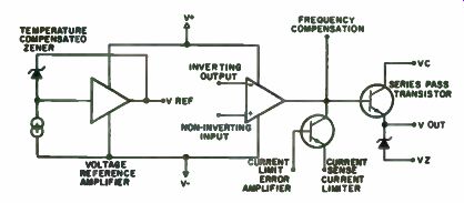 Surprisingly Low-Cost Lab Supply The µA723, as first introduced by Fairchild, is one of the oldest and most accepted regulator ICs in the industry. The µA723 is second-sourced by almost every linear IC house in the U.S. and still enjoys enormous usage. Thus, this IC has become about as inexpensive as a linear IC can be. The µA723 equivalent circuit is shown in Fig. 13-1. Because \ref (the internal reference voltage) is about 7 volts, the µA723 is usually configured in one of two basic circuits-one for output voltages below 7 volts and the other for output voltages above 7 volts. These basic circuits are shown in Fig. 13-2. The usual external current increasing transistors are not shown here, in order to keep the circuits simple. One of the linear IC houses which makes the equivalent of the µA723, Teledyne, has published an application note in which is shown a novel circuit that allows output voltages above and below 7 volts. That basic circuit is shown in Fig. 13-3. This circuit has in it a correction that was made from the original (which would have prevented the current limit from functioning). A complete lab-regulated supply providing 2 to 20 volts DC with current limiting at 300 mA is shown in Fig. 13-4, with an NPN power transistor to increase current capability. The IC pin connections in Fig. 13-4 are for the dual inline package version of the µA 723 only; the "TO-5 can" packaged 723 would work as well, but pin numbers would have to be changed. The rectifier-filter section utilizes a Triad F91X transformer and a full-wave rectifier with capacitor input. The rectifier diodes are Motorola HEP R0051s, but almost any two 1 amp silicon rectifier diodes ( 1N4002s, for instance) could also be used. Q1 is a Motorola HEP S5000, but it has several equivalents-RCA SK3041, Sylvania ECG152 or 2N5191. All the parts are board mounted, with the exception of the transformer, filter capacitor and 25k voltage-control pot. In off-board mounting of the 25k pot (say on the front panel of one's own power supply cabinet), the lead lengths of the wires to the pot should be minimized. It is intended that the AC switch, fuse holder, meters (if used) and binding posts also be mounted on the cabinet housing the circuit board. LMB and Bud each have a line of small box cabinets that would be suitable for making a finished bench supply using this circuit. The choice of which particular cabinet will usually be dictated by the meters one has on hand, because the circuit board is only 2" x 2 1/2 ". An LMB W1N box cabinet ( 10" x 4" x 3 1/2 ") was used for the metering circuit shown in Fig. 13-5. Only meters that were on hand were used.
