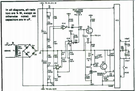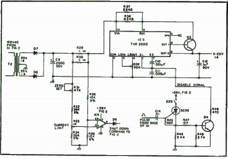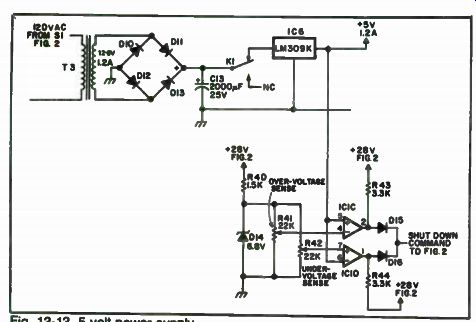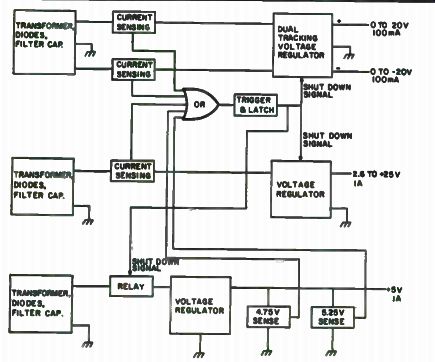 ... divided down by R15 and R17 so that the voltage across R17 switches between 0 volts and - 0.25 volts. R16 and R18 form another voltage divider which provides - 0.15 volts to pin 8 of IC1B. Thus IC1B switches like IC1A in response to an overcurrent in R14. D5 and D6 form an OR gate, hence isolating the outputs of IC1A and IC1B from one another. In Fig. 13-12, current sensing is done in the same manner as described for the positive leg of Fig. 13-11. Since the maximum current for this supply is 10 times greater than for the first supply, resistance values have been adjusted accordingly. D9 forms another part of the OR gate that feeds R21. Voltage Sensing. For the 5 volt supply in Fig. 13-13, it is more desirable to have output sensing than current sensing. This is because there are wide variations in the current demanded by TTL circuits when they are switching from state to state. The current limit point would always have to be set rather high, and consequently only gross overcurrents could be sensed. On the other hand, a circuit that senses when the voltage falls below 4.75 volts, the lower operating limit for 7400 series TTL, is quite useful. Suppose, for example, that you are operating near the 1 ampere limit of IC6; a brief current pulse could exceed this limit and the internal circuit of IC6 would then allow the output voltage to drop. Without voltage sensing this could easily go unnoticed and your circuit would malfunction. In Fig. 13-13, D14 provides a reference voltage. R41 acts as a voltage divider and is set to 5.25 volts. R42 is another voltage divider and is set to 4.75 volts. IC1C and IC1D compare the output of IC6 to these voltages and, if the output moves outside the window from 4.75 to 5.25 volts, pin 1 or pin 2 will go high. This signal goes to R21 of Fig. 13-11 and eventually shuts down all the supplies.