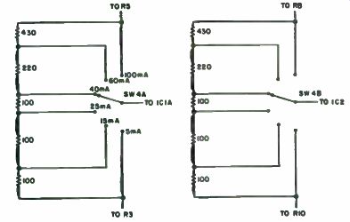 The Voltage Regulators. The 419TK regulator is readily available. It is internally current limited at about 350 mA when the positive output is shorted to ground. It also has internal thermal limiting that will reduce the output when it gets too hot. A small heat sink is required when the operating current is 100 mA in each leg of the output. In Fig. 13-11, S3 is normally open. When S3 is closed, R27 can be adjusted to give + 12, - 6 volts output for the operation of certain types of voltage comparators. The 309K also has current limiting and thermal limiting. It will provide a little over 1 ampere when mounted on a heat sink with the circuit shown. The TVR2000 has been available from Poly Paks for a number of years and is quite inexpensive. In Fig. 13-12, a foldback current limiting option is not used. Instead, simple short circuit sensing is used. R37 and R38 set the short circuit current to a value of about 1.2 amperes. The relationship here is Rsc 1 out --- 0.1 volt, where R37 and R38 in parallel make up R.c. R39 sets the output voltage. Q3 acts as a current booster and is mounted on a heat sink. C10 stabilizes the current limiting circuitry and C11 stabilizes the regulator section of IC5. Different values from those shown may be required to drive high capacitance loads. Selecting Resistors. Resistors of 1 percent tolerance are best for R1, R3, R5 to R8, R10 and R12 to R14. This will make the final adjustments simpler and will keep tracking errors in R4 and R9 to a minimum. In Fig. 13-12, 5 percent resistors will suffice for R32, R34, R35 and R36, providing you choose them such that R32 R34 and R36 Regarding the tracking of R4 and R9 -since they form a tandem control, it is important that they both exhibit approximately the same resistance between their wipers and their ends for all rotations of the shaft. Failure to do so will mean that the positive will trip at different currents. If you want very good tracking, replace both R4 and R9 with a series of 5 percent resistors and use a two pole rotary switch to select the current limit you want as shown in Fig. 13-14. Construction. All three supplies were constructed on a single 4" x 5" printed circuit board as shown in Figs. 13-15 and 13-16. IC3 does not plug directly into the board. The holes in the board have been spaced out to assure clean etching. Solder a short wire to the outside of each pin of IC3.
