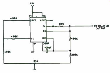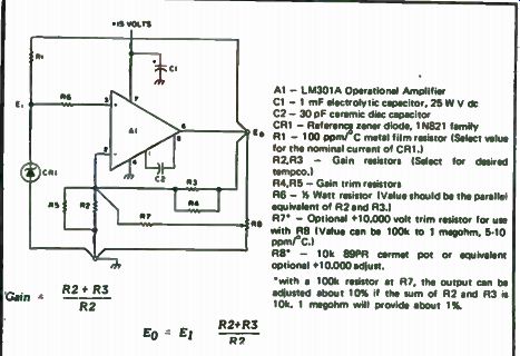 Insert the wires into the PC board and solder. A piece of aluminum was bolted to IC3 as a heat sink. There are so many connections to the PC board from the external switches, controls, transformers, etc., that it was not possible to arrange for an edge connector on a board of this size. Instead there are about 35 wires soldered at various points around the edge of the board and all are routed to one end of the board can be hinged outward from the chassis if parts on it need to be replaced in the future. All components fit nicely on a chassis 10" x 6" x 2". Final Adjustments. Switch S2 to reset. Leave S3 open. This disables the shutdown mechanism. Connect a high impedance voltmeter between pin 7 of IC1D and ground. Adjust R42 for a reading of 4.75 volts. Connect the voltmeter between pin 4 of IC1C and ground. Adjust R41 for a reading of 5.25 volts. Set the wiper of R33 to the end closest to R32. Connect a voltmeter between pin 6 of IC4 and ground. Adjust R31 so that the reading just goes to zero. If you are using a dual potentiometer for R4 and R9, proceed as follows: Set the wiper of R4 to the end closest to R3; the wiper of R9 should then be at the end closest to R10. Connect a voltmeter between pin 13 of IC1A and ground. Adjust R2 until the reading just drops to zero. If you run out of adjustment with R2, interchange R6 and R7 and try again. Connect the voltmeter between pin 14 of IC1B and ground. Adjust R11 until the reading just drops to zero. If you elect to use the switched resistors in Fig. 13-13 proceed as follows: Set the switch in Fig. 13-13 to the 5 mA position. Connect a load between the positive and negative output terminals of the supply and adjust the output voltage so that the load draws 5 mA. With a voltmeter from pin 13 of IC1A to ground, adjust R2 until the voltage just drops to zero. If you run out of adjustment with R2, interchange R6 and R7 and try again. Connect the voltmeter between pin 14 of IC1B and ground. Adjust R11 until the reading just drops to zero. Precision + 10.000v DC Voltage Reference Standard This is a simple, easy to build DC voltage reference standard whose temperature coefficient (tempco) can be tailored to the hobbyist's individual requirements. It can be used by itself or as an individual circuit element. Design Considerations. The circuit described uses an operational amplifier in a non-inverting circuit utilizing a single positive supply (Fig. 13-17). The output of the reference standard supplies the zener reference diode current, providing a stable supply voltage for the zener and de coupling from the positive supply voltage. The positive supply voltage should be regulated by either a three-terminal regulator or zener diode and should be from ±15 to ±18 volts. Temperature stability is expressed in percent/°C or ppm (parts per million)/°C. (. 0001 percent/°C is equivalent to 1 ppm/°C.) A 1 ppm/°C ...