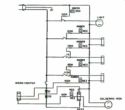 ...to explain a device to simulate a load on various power sources in order to check the load performance of those sources. This project covers the building of two simple load banks or dummy loads for small and rather large sized DC power supplies that are finding present usage with experimenters and hobbyists. It can be done economically and with readily available parts. Also, using the basic ideas presented here, load banks for almost any type of low voltage power supply can be built. In order to properly evaluate the performance of a power supply (whether home built or commercially built), the supply must be tested at various degrees of loading-that is, no load, half load, full load, etc. The major requirement for a suitable load bank is that it be capable of providing these various load conditions. Thus, several load elements are required, or at least one large variable element is required, in order to cover several different load conditions. These load elements would typically be large fixed or variable power resistors. If the power supply is of any size, the load elements have to be of high power rating ( 10, 25 or even 50 watt). A look at a parts catalog will show that power resistors get expensive as the power rating goes up and the different ohmic values available go down. Also, power resistors present the problem of how to get rid of the heat and how to conveniently mount the resistors. Instead of using the regular power resistor in the design of these load banks, automotive bulbs and pilot lamps were used. These are readily available at auto parts houses and even department store electrical parts sections. Bulbs are selected on the basis of voltage and current requirements and typically work out very nicely in regard to both values. The problem of power dissipation is very minimal and mounting can be very simple. With the load elements decided, the actual construction of the load bank can begin. The first load bank requirement was for a rather large 13.8 volt DC 24 amp DC supply. It was decided to check one third, two thirds, full load and 133 percent of full load. Voltage and ripple were observed under the various load conditions. The #1073 automotive bulb was selected with a nominal rating of 12.8 volts @ 1.8 amps. Typical cost is less than 30 cents. Since the power supply voltage was to be a volt higher, the current at that voltage was approximated to be about 2 amps. This is a fine feature of these bulbs-the voltage can be increased up to 20 percent of nominal rating without any problem in this application. The bulbs were arranged in four groups or sections of four each. Each group presents a load of about 8 amps at nominal voltage to simulate four load conditions. In order to keep costs down and construction simple, the wires consisting of # 14 TW wire were soldered directly to the bulb bases. The start and end of each section wire were wrapped around a nail which was driven into the wooden base board. This eliminated expensive sockets and, after all, a load bank is not a device that is normally on display in the shack. Since this load bank was to be used for a considerable amount of testing and since four surplus relays were available, each load section was wired through relay contacts as shown in the diagram. Any combination of loading can be quickly selected. This extra feature can be eliminated with just the use of solder connections or switches with proper current rating. The switching feature is certainly handy if considerable testing is to be done, but adds considerably to the parts cost if the junk box is not well stocked. The second load bank was for a much smaller DC power supply with a rating of 5 volts@ 1 amp. Following the same design features of the previous load bank, a #592 bulb was selected as load element in four sections with two bulbs in each section, giving 30 percent, 60 percent, 90 percent and 120 percent of full load. Since the current requirements were much less, about 0.3 amps per section, regular #22 solid hookup wire was directly soldered to the bulb bases and toggle switches (or even slide switches) used for controlling the load sections. A small wood base board was again used for mounting the bulbs and wiring with a small 1/2" pressed board panel (nailed to the edge) to support the switches. This supply is most useful for checking logic power supplies used with ICs. Overload or current foldover characteristics can be checked on supplies designed with that feature. There are many advantages to these simple load banks besides the cost and ease of construction. The bulbs present a large amount of light under full load to leave no doubt that the supply is working. Also, there are no burn marks from power resistors on the workbench or, even worse, the dining room table. Buying the bulbs by the box reduces cost and automotive type bulbs are readily available, even at gas stations. The purists may argue that the bulb is not a constant load resistance due to the filament characteristics. This sudden heavier than normal load when voltage is first applied to the bulb is very short in duration and provides an even stricter load test of the supply being tested. The load bank ideas presented here can be extended to other sizes and types of load banks by changing the bulb types and the number of bulbs in a section, and even the number of load sections. These load banks have been used to check voltage and ripple conditions on a variety of home brew and commercial supplies. The cost is certainly cheap if proper shopping around is done on the choice and source of bulbs. The Smoke Tester Power Supply Checker Outer This tester allows full power (smoke) testing of large or small power supplies before they are put on the rig. It will tell how many volts at how many amps the supply can deliver and what kind of voltage loss to expect under load. It can also help determine some of the attributes of low voltage power transformers, without having to wire them into a p
