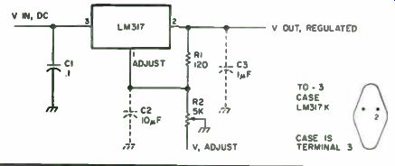 The new LM317 is an adjustable, three-terminal positive voltage regulator. Its simple external connections rather belie the complexity and performance features of the unit. As shown in Fig. 13-6, it has only simple in/out connections and a minimum of three simple external components are required. The output voltage is set by the ratio of two resistors, R1 and R2. By making R2 variable, one can adjust the output voltage to be any value from a few volts less than the DC input voltage to the regulator down to a minimum of about 1.2 volts output. Thus, if the input DC voltage were 40 volts, the output voltage can be continuously varied from about 37 volts down to 1.2 volts. Although the output voltage is determined only by a resistor setting, the output voltage is regulated at any given setting. The regulation will be about 0.1 percent going from no load to full load (1.5 amperes, assuming the transformer/rectifier used for the DC input voltage handles this current). The LM317 is also overload and thermally protected. If the current limit is exceeded, such as by short circuit, the LM317 will simply "shut down." If the regulator gets too hot, either because of excessive load current and/or inadequate heat dissipation, it will also protect itself. Although one can destroy the LM317 like any other IC, it is pretty hard to do with any sort of reasonable care. The manufacturer suggests two additional capacitors (C2 and C3) be used, which may prove useful in some applications. C2 is used to bypass the adjustment terminal to ground to improve ripple rejection. This bypass prevents ripple from being amplified as the output voltage is increased. About 60 dB ripple rejection is achieved without this capacitor, but it can be improved to about 80 dB by adding it. A 10 mF or greater unit can be used, but values over 10 mF do not offer any significant advantage in further ripple improvement. The manufacturer particularly recommends the use of a solid tantalum capacitor type since they have low impedance even at high frequencies. An alternative is the use of the more readily available and inexpensive aluminum electrolytic, but it takes about 25 mF of the latter type to equal 1 mF of the tantalum type for good high frequency bypassing. C3 is added to prevent instability when the output load presents a load capacitance of between 500 and 5000 pF. By using a 1 mF bypass at the output (solid tantalum again or aluminum electrolytic equivalent), any load capacitance in the 500 to 5000 pF range is swamped and stability is ensured. Both the C2 and C3 will not be required for many applications where the LM317 is being used with a specific load circuit. But is the LM317 is used as the heart of a general purpose bench type power supply, they should be included. Figure 13-7 shows a PC board layout and component placement diag ram. This layout has been suggested by the manufacturer, but there is no need to follow it exactly as long as all of the external components are grouped around the regulator with solid short leads. The diagram show the LM317 in a TO-220 plastic case which is designated the LM317T. Most amateurs will probably prefer to buy the LM317 in the familiar TO-3 metal case and, in this case, it is the LM317K. But, when using the unit, note an important difference as compared to the old LM309K. The case on the ...