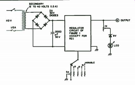 The latter 5k pot is front panel mounted. The function of the LED is described in the text to about 24 volts. All outputs can deliver at least 1.5 amperes with the components specified. The supply is simple to build in any size metal enclosure suitable for the components used. The only precautions to ob serve are to firmly heat sink the LM317 to one side of the metal enclosure and to keep the 0.1 mF capacitor going from pin 3 to ground, the 10 mF capacitor going from pin 1 to ground and the 120 ohm resistor going between pins 2 and 1, all connected directly at the LM317 terminals. The other components may be mounted wherever it is convenient to do so. The zener diode/resistor/LED combination at the output of the supply serves as a crude but useful voltage output indicator without having to build a regulator voltmeter in the supply. The LED just starts to glow when the output voltage is about 9-10 volts (depending on the tolerances of the components used). The 1k resistor is adjusted so the LED just glows fully when the maximum output voltage is reached. So by using the fixed output voltage positions (which are adjusted using a good VOM) and watching the LED, one can obtain a fairly good estimate of what the variable output voltage is set for.
