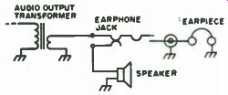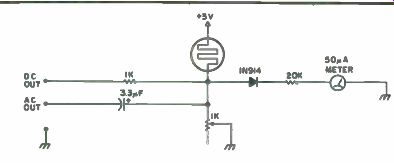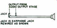 ... may' create stray light problems. For general use, the indicated values work very well. There is nothing magic about the voltages shown for the op amp-six volts or so would work as well. Note that there is no need to use shielded cable for the cell leads. As with most projects, just about the time you get the last screw in place, there is that little voice whispering in your ear, saying, "I wonder what would happen if . . . 7" Well, this project is no exception. Figure 2-13 shows what happens when you listen to little voices. The AC power supply has disappeared, replaced by two C cells in series. The op amp has vanished because a more sensitive (50 microamp) meter has been used. The diode in series with the meter is used to provide a hold-off threshold effect so a small steady meter reading is cancelled. Either unit does about the same job of providing your bench with a photocell dimension that will find many uses. El Cheapo Signal Tracer Every hobbyist needs a cheap signal tracer and audio amplifier at some time or another. If you try connecting a 117v AC to the audio output jack of a six meter receiver, you'll find you need one, too. Keep in mind that if you would try such a stunt, you'll have some painful memories. One foolish experimenter tried this and when the smoke cleared, the two audio output transistors and their transformer were in such a mess that they were eligible for foreign aid (it's a Japanese receiver). Wanting to get back on the air fast, the hobbyist rummaged through the junk box until he found a cheap transistor radio. With this, a resistor, a capacitor and 10 minutes of work, he was back in business. Best of all, the transistor radio was still usable once the six meter receiver was fixed. The modification to the pocket radio involves four steps. • First, find the earphone jack and the earpiece and cord that plug into it. Inside, the jack will have three wires connected to it: a ground, a lead to the speaker and another one trailing off to the innards of the radio somewhere. This last wire actually goes to the secondary winding of the audio output transformer (Fig. 2-14). Leave the ground wire undisturbed. Unsolder the wire to the speaker and the one to the innards, both at the jack, and note which went where. Solder the ends of these two together and tape them. Now the radio is permanently connected to its built-in speaker. • The second step involves finding the point where the diode detector connects to the volume control. This can be found by tracing back from the center pin of the volume control along the foil until you find the glass diode. Unsolder the end of this volume control, but leave the other end connected. Solder a piece of insulated hookup wire to the free end of the diode. The other end of this wire is soldered to the pin on the earphone jack that was formerly connected to the...