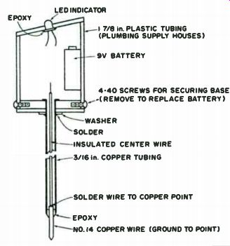 ...speaker. Solder another piece of insulated wire to the point on the circuit board where the free end of the diode used to be. The other end of this wire is connected to the remaining pin on the earphone jack that used to be connected to the innards. Now, without a plug in the earphone jack, the pocket radio will play normally since the diode detector is connected to the volume control once again, although now through the contacts of the earphone jack (Fig. 2-15). • For the third step, cut the earpiece off the end of its cord. Strip the ends of the wires, and with an ohmmeter or continuity checker, find out which of the wires goes to the inner pin of the jack and mark it. The other lead is the ground connection which can be connected to an alligator clip. Solder one lead of a 1 uF capacitor to the "hot" lead. This capacitor will keep stray DC voltages out of your pocket radio, thus preventing premature trauma. The free end of the capacitor is the probe tip, and is to be connected to the equipment under test, wherever you suspect audio should be. With the earphone plug inserted in the jack, and the probe connected to the circuit under test, you should now hear the desired signal, rather than Olivia Newton-John. The lead with the capacitor can be built into the plastic end of a discarded ballpoint pen, to make a neater probe tip. The voltage rating of this capacitor must be higher than any voltage you have in the equipment under test. For tube type receivers, 600 volts is usually adequate, while a 50 volt capacitor is adequate for transistor receivers and hi-fi gear. If you're going to run the pocket radio from its own battery, this step may be omitted. If you would like to run the pocket radio from the voltage in the gear under test, this formula can be used to find the right value of dropping resistor: Resistance= (Available Voltage) - (Voltage Needed) Receiver Current For example, if your pocket radio needs 9v to operate, and 12v is available, and the pocket radio draws an average of about . 010a, then by plugging the numbers in: 12-9 / 0.01 = 3 / 0.01 = = 300 ohm resistance needed The wattage needed for the resistor can be figured by the formula I^2 R = P; that is, the current multiplied by itself, times the resistance, gives the needed power rating in watts. In this example, it would be (0.1) x (. 01) x 300 = 0.03 watts. A 1/4 watt resistor would give a more than adequate safety margin. If you're planning to use a 150v supply to run the pocket radio, a 14.1 k-O at 1.4 watts is the calculated value, and 15k-ohm at 5 watts is adequate and a practical common value. This resistor is connected between the positive terminal of the battery holder and the supply voltage point, as shown in Fig. 2-16. Fig. 2-16. Battery terminals with added dropping resistor. Once completed, the pocket radio can be. used normally. By just plugging in the earphone plug/test probe, it becomes a signal tracer or audio amplifier. Total cost is less than 50 cents and you've still got your radio. Test Instrument Saver Delicate, costly test instruments may suffer severe damage when their conventional, too long leads snag on tools or on components spread out on the workbench and are inadvertently yanked off it to the floor. A partial cure for this hazard is to replace the long leads with the much shorter coiled leads commonly used on cameras and flash units. The coiled leads can be stretched out to where needed. When let go they retract out of harm's way. Should they lose their recoil power, rewinding the coils in the opposite direction helps restore their springiness. Since each lead has two wires, their extra continuity gives them longer life. The Violet and Other Houseplants Tester The device we are about to describe might be classified as a "one evening kit" and does just as the title says-it tests violets. Not only does it test violets, but other miscellaneous houseplants as well. This gadget detects the presence (or absence) of moisture and informs people when it is time to water their plants. The violet tester does not require exotic memory ICs, clock chips or printed circuit boards. One LED (garden variety), a single 330 ohm resistor and a 9 volt transistor radio battery are all the parts needed for the heart of the device. The testing probe, case, etc., may be constructed of miscellaneous junk that you have accumulated. If you will notice Fig. 2-17 the 9 volt transistor radio battery is in series with the 330 ohm resistor and LED indicator. The 330 ohm resistor limits the current to the LED. Without the current limiting resistor, the LED would draw excess current and soon destroy itself. Also in series with this are test probes. These probes, when inserted in the soil, will provide a current flow or complete the series circuit if moisture is present. The amount of moisture and mineral content of the soil will determine the current available to light the LED. Therefore, when adequate moisture is present, the LED will come up to near full brilliance. Varying lesser degrees of illumination will indicate less moisture. At this point may we indicate that the violet tester is not a laboratory standard-it is merely a gadget in indicate relative moisture, and at that, serves its function well. What we are trying to say is-if some plant suddenly shrivels up, it is not the fault of the violet tester. On the other hand, if the vegetation involved suddenly tries to molest you some evening due to its fantastic state of health, it also is not the fault of the tester. Anyway the device has proved to be much more sensitive than we had expected prior to construction. Common LEDs seem to be very responsive to minute current changes. The moisture probe does not have to be a single chunk of copper tubing such as we have used. A pair of separate probes spaced 1" will work equally as well. The only requirement is that they be rigid enough to penetrate the soil.