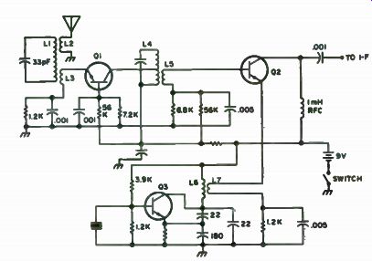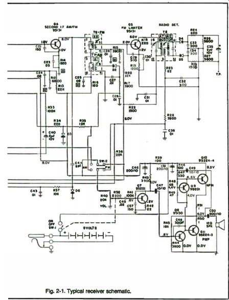 NOTES, RESISTANCE VALUES ARE IN OHMS 11.1000 ALL RESISTORS. AND 1/2 WATT UNLESS OTHERWISE SPECIFIED. ALL VOLTA«. MEASURED FROM 5- WITH A V.T.V.M. WITH NO SIGNAL. ALL CAPACITORS 25 VOLTS UNLESS OTHERWISE SPECIFIED. COLOR CAPACITANCE VALUES LISTED IN DECIMALS ARE IN MICROFXRADS, 50T le AND VALUES GREATER .TNAN 1.0 ARE PICOFARAOS UNLESS OTHERWISE SPECTRA. COMMON (ROUND SIMIOS.. ---------------------------- Signal Tracer. The radio will work as several different tracers. The most obvious use is shown in Fig. 2-5A, an audio signal tracer. Injecting a signal at the detector as shown in Fig. 2-5B yields an rf demodulator tracer. If you inject a signal into the i-f as shown in Fig. 2-5C, you have a 455 kHz tuned tracer (or 10.7 MHz if the radio has FM) for use with standard i-fs. If you allow disabling the oscillator as in Fig. 2-5D, you can inject another radio's oscillator signal to test the oscillator section of the other radio. Just inject the local oscillator from the radio being serviced, juggle the dial on both radios, and if you can pick up signals, the oscillator in the other radio is working. The same method could be used for FM systems. In that case, couple the oscillator signal to the FM converter stage through a gimmick of about seven twists of hook-up wire connected in the same place on the FM converter stage. You will have to add a switch to disable the oscillator as