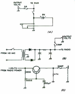 AMAZON multi-meters discounts --- AMAZON oscilloscope discounts A Free Test Lab Just about everyone needs more test equipment, or easier ways to use the test equipment he already has. Just about everyone has an old radio sitting around and this can provide the needed test equipment. You merely need to make the proper modifications to the radio, then know how to apply the resultant piece of test gear. Here are some modifications which will allow you to add a mess of handy test equipment to your shop, and still leave your old transistor radio in working order. The finished device will be everything from a speaker subber to transistor checker. It will still provide your favorite news or music while just sitting on the bench. The first consideration is what to do about packaging the radio. You may decide to leave the radio intact and add plugs and jacks of your choice in the radio cabinet. You could run leads out from the radio cabinet and put the plugs, jacks and switches on a mini-box. Or you could package the radio complete with modifications in the box of your choice. No matter what the package you choose, be sure to decide on plugs and jacks that you already have around so you don't make all your test leads obsolete. The diagrams that follow show the use of phone jacks, but you could just as well use banana jacks or whatever. Figure 2-1 shows a typical radio schematic. Some will differ, especially in part values, but the stages are essentially the same as the one shown. At least this diagram is helpful in locating where to put the modifications in your particular radio. You may add any or all the modifica tions to make a speaker subber, power supply, audio oscillator, signal injector, transistor checker, alignment generator or weather receiver. Speaker Subber. This is the simplest modification. You may add a plug as shown in Fig. 2-2 or you may modify the earphone jack already on many radios. When a phone plug is plugged in, the speaker is automatically disconnected. A pair of alligator clips on the end of the leads will allow you to connect to almost any source. Power Supply. Whether your radio is battery or AC power, it will give you an easy source of 9-12 volts DC depending on the radio. All this without tying up the main power supply in your shop! When you are using the other radio circuits to check out a radio or experimenting with a circuit on the bench, the radio power supply will run both the test equipment and the radio or circuit under test. Figure 2-3 shows some of the suggested modifications for both battery and AC power supplies. In Fig. 2-3C a transistor is used as a voltage source to provide variable voltage outputs from the radio supply. You cannot ruin the pass transistor circuit. If you have a battery level indicator on your radio, it may be calibrated and used as a voltage indicator. By adding a resistor network and range switch in place of the potentiometer, you can have discrete voltage outputs such as 1.5, 5.9, etc. Audio Oscillator. Figure 2-4 gives the modifications which make an audio oscillator. The result can be used as a code practice oscillator, test oscillator, audible continuity checker or audio signal injector. The tone control provides some measure of control of the basic oscillator frequency. -----------------------------
