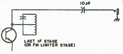 Signal Injector. The output of the converter taken from the point shown in Fig. 2-6A provides a 455 kHz signal for checking the i-f of a radio. An equivalent point on the FM converter provides 10.7 MHz signals. Tune the radio to a station and the 455 kHz output will be the signal transmitted from that station. Figure 2-6B shows the connection for injecting audio signals; just tune in a station and use its audio to check out the audio circuits under test. Alignment Generator. In Fig. 2-7 the output from the i-f is taken after it has gone through several stages of i-f amplification. Since this signal has the benefit of the several stages of selectivity, the i-f output signal can be used as a source of accurate 455 kHz (or 10.7 MHz) assuming the radio has been accurately aligned. Merely align the radio as one of the steps to making it into a piece of test equipment. Signals tuned in on the radio will be translated to their equivalent i-f frequency and can be used as alignment signals. Transistor Checker. Figure 2-8 shows an outboard circuit added to the radio to allow in or out of circuit transistor checking. If the transistor under test will oscillate, it is generally good. This is a fairly accurate check in or out of circuit. Another simpler tester can be fabricated by merely replacing one of the transistors in the radio with a socket. When a transistor close to the type you are replacing it with is put in the socket, the radio should work. This test is only accurate for the NPN or PNP transistor type being replaced, and ...