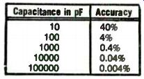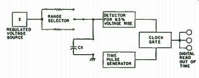 ... actual value. If extension leads of more than 2" are required, the same procedure should also be used on the x10 ( 10-100 pF) scale. A Digital Capacity Meter Simple Construction Project There are many means of taking the measure of a capacitor. For the range of capacitors that the instrument to be described can handle (approximately one microfarad to 99,900 microfarads), the best method to refer to is time versus voltage. Mother Nature and science reached a detente relating the charge or discharge to reach some specific limit. The charge limit reaches 63 percent of the applied voltage in RC seconds, where R is in megohms and C is in microfarads. Thus, if you were to apply exactly 10 volts to a capacitor which you made sure was totally discharged, through a resistor of 1 megohm, and you monitored the voltage rise across the capacitor with a voltmeter that did not load down the circuit, you could use a stopwatch to time the number of seconds it took for the voltage to hit 63 percent of 10 volts, or 6.3 volts. It is easy to see that a 1-microfarad capacitor would time out at 1 second and that a 100-microfarad condenser would time out at 100 seconds. You could work the same general method using the discharge curve, but your point of measurement would be when the voltage had fallen 37 percent from a fully charged capacitor. Herein lies the rub, for it is much harder