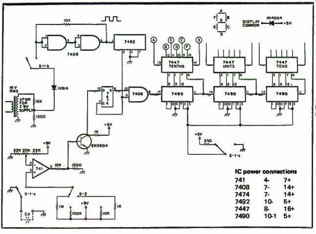 ...in magnitude than the positive voltage applied to the noninverting input, the output of the op amp (pin 6) is highly negative. When the charging voltage of the capacitor under test reaches and just slightly exceeds the reference voltage on the inverting input, then pin 6 (output) goes highly positive. In this fashion, by changing output polarity, the comparator gives a fixed point in time when the charging voltage just exceeds the reference voltage applied to the inverting input of the op amp. Now all you have to do is provide a means of automatically starting a "clock" coincident with the start of the charging cycle and use the flip-flop of the comparator to stop the clock. Then the capacity of the unit under test is merely the multiplier of the range switch times the number of full and fractional seconds shown on the three-digit readout. Tackling the bits and pieces of how this all happens, consider the output swing of pin 6 of the comparator. It goes from approximately minus 8 to plus 8 volts in the course of normal operation. The function of Q1 (2N3904) is to convert this voltage swing to standard voltage levels acceptable to the TTL logic blocks used in the unit. In addition to this interfacing function, the output from the collector is inverted in polarity, which you will see is needed to fit the rest of the circuit functions. Since the timing chain starts in the power supplies, just a word should be said about that here. The 5-volt supply is run of the mill with a 1-amp capacity regulated by an LM309K. You can lash up any kind of a plus and minus 9-volt supply you care to for the op amp, but it must be zener regulated, at the least. From the transformer for this split supply, you need to provide a source of 60 Hz voltage from a voltage divider ( 1.3 to 1.5 volts AC), the only proviso being that the leg of the divider to ground should be about 1500 ohms or less. This is so the squaring circuit which is next in line sees a reasonably low impedance. The low-voltage AC goes to the two sections of the 7408 through a diode. The output amplitude is a rather decent 60 Hz square wave, about four volts in amplitude. This square wave is applied to the divide-by-six section of a 7492, which results in a 10 Hz output. The digital readout section consists of three 7490 decade dividers, each of which is connected to a 7447 seven-segment decoder driver. If you skip ...