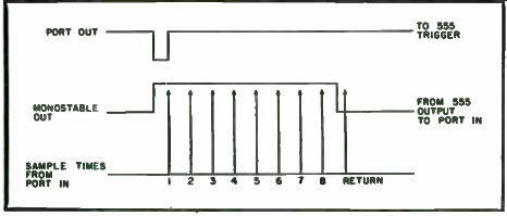 This simple circuit is an easy one-evening project that when completed will provide an audio tone comparison of a built-in reference capacitor to an unknown capacitor connected to the test clips. Bearing in mind that the larger the capacitor the lower the tone, it is a simple matter to establish the value of unmarked units. The circuit (Fig. 4-15) will identify caps between . 5 pF and . 001 uF by providing tones between 8 kHz and 100 Hz. The heart of the tester is a 555 timing IC and may be operated from any DC voltage source between 8 and 14 volts. An LED indicator is provided for testing values larger than . 001 uF which do not produce a tone but merely turn the LED off and on. A.1 uF unit will trigger the indicator at approximately 5 Hz. Piston, compression and rotary trimmers may be identified by first making a comparison fully closed and then fully opened. Small gimmick caps made from twisted leads are also easily sized. The LED is, of course, optional, as well as the number of reference capacitors. Any NPN switching or audio transistor may be used in place of the MPS6512. If the LED is not needed, the transistor may be eliminated and the speaker with its 1 . uF coupling capacitor is connected directly to pin 3 of the IC. Why not try a Poly Paks unmarked assortment at 100 caps for $1.98? Computerized Capacity Meter Caught up in the hacker frenzy while attempting the design of some higher-order active filters? If you have ever spent more than a few hours programming an SR-52 to solve cubic and quartic equations, you have realized that some heavier-duty number-crunching was called for if you really wanted to obtain those steep skirts. If you head to your local friendly computer store, you will return several hours later with several heavy boxes and one extremely light wallet. The kits will go together surprisingly well and produced only a couple of minor bugs.' You may now also need several close-tolerance capacitors. But if you do not have any kind of a bridge for measurement and if the state of your wallet precludes the purchase of such an instrument (or even the cost of several 1 percent capacitors for a one-off filter), you can make use of items you find in your junk box to build something that would do the job with a little assistance from the computer. Overall Design Considerations. The design considerations are simple: • It has to be extremely cheap to build. • It has to be extremely easy to build. • It has to use a minimum of both hardware and software. • It has to be reasonably accurate. The resulting circuit uses only three readily-available components, a small machine language routine (which can be called from BASIC) and the accuracy is limited only by the clock speed of the computer system being used (Table 4-4). Figure 4-16 offers a thorough description of the method with a flowchart. This enables the system to be tailored to any computer. Circuit Design. The circuit consists of a 555 timer chip wired in a standard monostable configuration (Fig. 4-17). Circuit Operation. The monostable is triggered under control of an output port bit. Triggering the 555 requires a trigger signal going from a high (+5) level to a low (0) level for a brief period and then returning the trigger signal to a high level (Fig. 4-18). The monostable now switches its output to a high level and this level is sampled at an input port until the monostable times out. While the monostable is timing out, a count is made. This count is ... ![]() Table 4-4. Assuming count loop for one count is approximately 20 microseconds.