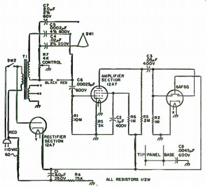 The circuit of the result is shown in Fig. 4-14. Despite its simplicity it works nicely for values from 25 pF to 10 uF. Q1 and Q2 are combined to form an audio oscillator, output from Q1 being applied across the bridge. The bridge has five capacitors for five ranges. Cx is the unknown capacitor. VR1 is a linear pot (it must be linear) for balancing, and high resistance phones indicate the null, so that the capacitor value can be read from the setting of VR1. Oscillator. Assembly details will probably not matter much, but the audio oscillator can be wired on a tag strip. Both the transistors are audio or small output types, such as are available in great number and it is difficult to find two transistors which will not work here. Q1 must, however, be NPN, while Q2 is a PNP type. A quite high tone is best. If necessary juggle with C6 or R2 or both to obtain this. The supply need not be 9v. The phones put across R1 will show how this works and two flying leads are soldered on to go to the bridge part of the unit. Bridge. The five-way switch selects any capacitor C1 to C5. Without using the extreme settings of VR1, where accuracy falls, the center setting of VR1 is obtained when Cx is the same as Cl, C2 or so on. As an example, if C3, 0.01 uF is in circuit, the middle setting of VR1 balances the bridge at 0.01 uF for Cx. From here, the swing of VR1 goes from 1/10 to 10 times, so that this range is 0.001 uF to 0.1 uF. In the same way, C2 ( 1000 pF) gives a range of 100-10,000 pF, while C4 gives 0.01-1 uF and C5 gives 0.1-10 uF. C1 would by the same token provide 10-1000 pF, but the null or balancing point for VR1, easily audible with larger values, grows a little difficult to hear at the extreme low capacitance end of this scale. It will be seen that the overlap is such that the same total coverage would be achieved with only Cl, C3 and C5. These three ranges would be 10-1000 pF, 0.001-0.1 uF and 0.1-10 uF. However, the extra capacitors C2 and C4 are well worthwhile to fill in for easy checking. C 1 and C2 should be silver mica 1 percent items. For C3, a 2 percent or 5 percent item will probably have to be adopted. C4 may be difficult to get with better accuracy than 10 percent, unless costly, while C5 is actually two 0.5 uF tubulars in parallel. This means that calibration can be accurate for the lower values, but is less so for high values. In any case much accuracy is often not necessary with large values, except possibly in audio filters and some other applications. These items are grouped mainly around the switch and the layout shown (Fig. 4-14) allows convenient wiring with the capacitors supported by a near tag of the audio oscillator section. Case. A plastic box about 6" x 4" x 2" with insulated panel is most suitable. It carries an outlet for the phones, on-off switch, two terminals for Cx and a bracket to clamp the battery in position. The scale for VR1 is marked 100 pF to 10k pF for C2 range and 0.01 uF to 1 uF for C4 range. The switch is marked pF and uF for direct reading of these ranges, and for uF x 10, uF 10 and pF 10 for the other ranges. Calibration is carried out on the C2 range, with several known capacitors, preferably 1 percent, such as 100 pF, 250 pF, 500 pF and a few others. Values can be obtained by paralleling some, such as 250 and 100 for 350 pF, while switching to C 1 range allows the 100 pF, 250 pF and other low values to be used again for what will be 1000 pF, 2500 pF and similar 10x values on the C2 range. No calibration is made for the large capacitor ranges, as these will be progressively 10x the existing ranges (assuming C3, C4 and C5 are accurate enough). A clip or two on short leads from the terminals will be handy for some capacitors. Simply rotate VR1 for the null and read the value on the scale. High impedance phones, in the 2k to 4k range, will be best. A dip but no real null shows leakage and is to be expected with electrolytic capacitors. The Capacitor Comparator If your junk box is tucked way back in the corner in a spot where you throw all those unmarked, unidentified capacitors that you just KNOW will come in handy some day, then this project is for you. Round ones, square ones, flat ones, fat ones, piston and bypass ones and those a guy could have a great time screw-drivering if he just knew where to use them are probably all in your box.