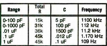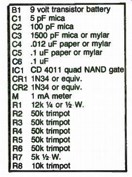 Table 4-1. Values for a 1 mA Meter Movement. ![]() Circuit Details. The circuit was set up to use a 1 mA meter movement. The values shown in Table 4-1 list the oscillator frequency, capacitor and resistor values for a 1 mA meter movement. There are five ranges arranged as decades. The lowest range is 0-100 pF, the next 0-1000 pF, etc. Each range is linear, so it is quite possible to read a 5 pF capacitor on the lowest range. The highest range then reads full scale on a 1 uF capacitor. It would be inadvisable to use a meter with less sensitivity than 1 mA if the 0-100 pF range is desired. Note that with the 1 mA meter, the oscillator is running at a frequency slightly greater that 1 MHz. This is approaching the top frequency for this chip in this circuit. Conversely, if a sensitive meter such as 50 uA is available for this use, it should be desensitized to some extent if the 1 uF range is desired. With a 1 mA meter, the oscillator frequency is only 109 Hz on the 1 uF range. The 50 uA meter would require this frequency to be reduced to 5 or 6 Hz for this range, which would require awkward capacitor values in the oscillator and an excessively large smoothing capacitor to provide a steady reading on the meter. Approximate oscillator frequencies for meter movements from 50 uA to 1 mA may be interpolated from Table 4-1. Construction. Table 4-2 lists the necessary parts. The instrument was housed in a discarded multimeter cabinet. One of the many miniboxes available would be entirely satisfactory. The circuit was constructed on a piece of perforated board which was mounted on the meter studs. Trimpots were used to set the battery check and individual capacitance ranges. The 5 pF capacitor for the 0-100 pF range was soldered directly across the IC socket and is in the circuit at all times. A five-position two-pole rotary switch is required. We added a battery check position on the switch, which required a third pole and sixth position on the switch. A push-button for the battery check function would do as well. The two leads to the binding posts of the unknown capacitor should be routed in the clear and not twisted together for neatness; their mutual capacity will show on the low range! Calibration and Operation. When the unit is completed, it should work just fine, but it probably will not. First check to make sure the gates are oscillating. Since they are biased in the linear mode, all gates and outputs should be at about half the battery voltage. If they are at zero of full voltage, they cannot oscillate. If they are at about half-voltage, they just about have to oscillate if the circuit is wired correctly. When oscillation has been proven, the diode circuit will rectify and indicate on the meter, unless a diode is reversed or there are other wiring errors. This is not a cranky circuit. After you find the wiring error and get the thing working, the rest is a snap. With a fresh battery, set the battery check trimpot for a full-scale reading on the check position of the switch. In spite of the junk box complex, most of us have some capacitors that are marked. Calibration was begun on the most sensitive range. Select three or four 100 pF capacitors and set the trimpot for a full-scale reading. Micas are usually pretty close and very little discrepancy will be observed. Also, check some smaller values, such as 50 pF, 10 pF and 5 pF to make sure that the scale is linear and all is well. Using the 100 pF capacitor, decade up to the next range and set the trimpot for 10% full scale. Now try a 1000 pF. It should read pretty close to full scale. ![]() Table 4-2. Parts List. --------------- B1 9 volt transistor battery C1 5 pF mica C2 100 pF mica C3 1500 pF mica or mylar C4 .012 uF paper or mylar C5 .1 uF paper or mylar C6 .1 uF IC1 CD 4011 quad NAND gate CR1 1N34 or equiv. CR2 1N34 or equiv. M 1 mA meter R1 12k 1/4 or 1/2 W. R2 50k trimpot R3 50k trimpot R4 50k trimpot R5 50k trimpot R6 50k trimpot R7 5k 1/2 W. R8 10k trimpot ---------------- In short, if you have a selection of known capacitors, you will be able to set each range without difficulty. Note that once you have proven the scale is linear, you can use intermediate values to calibrate. A . 5 uF capacitor can be used to set the 1 uF range, for example. It is best to try three or four different capacitors of different types for each range. You will find that consistency can be achieved and the calibration is sufficiently accurate for all practical purposes. If you are a nitpicker and have a friend with a good bridge, you can achieve good accuracy. Operation is very simple. Place the capacitor across the binding posts and depress the button. Read the capacity on the meter. If the meter tries to go beyond full scale, go to a higher range. If the meter reads less than 10% full scale, turn to a lower range. That's all there is to it! The circuit is self-limiting; the meter may bang over full scale if the capacitor is too large for the range selected, but the current supplied will not burn out the meter. No current is drawn from the battery unless you depress the push-button, so the battery cannot be run down because you forgot to turn the thing off. Current drain while checking is less than 5mA. Build This Digital Capacity Meter One of the common problems any constructor faces is determining the exact capacity of a capacitor from his junk box or for use in af filters, etc. Small (and cheap) RLC bridges are not accurate enough and if, for example, you try to measure 100 mixed values of capacitors from a surplus pack, you may well run out of patience. Furthermore, in the age of integrated circuits and frequency counters, everybody is getting lazy. Well, here is an instrument which eliminates all these troubles, presents the value of capacity instantly in digital form, is highly accurate and is fairly simple to construct. First, some information about the C-meter: • It measures capacitors from 1 pF to 1 uF in two ranges-9999 pF and 999.9 nF. • D