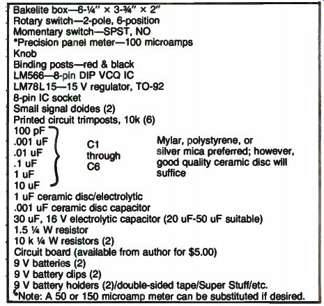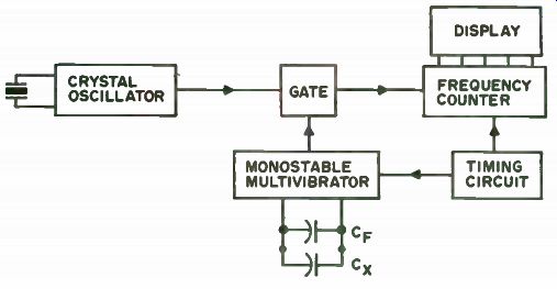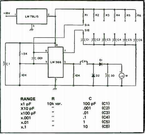 The second part of the C-meter can be checked with a frequency counter (output from IC14D pin 6). You must, of course, simulate the function of the range switch S1B. Output frequencies (at pin 3 of IC14C) must be exactly at the ratio of 1:100. The latch and reset pulses can be checked with an oscilloscope or, preferably, with a logic probe. Alignment. If both parts of the instrument work satisfactorily, solder the two printed circuit boards together. Five thick wires should be soldered onto the counter board. To make this operation easier, use differently colored insulation on the interconnecting wires. The same applies to the range switch wiring. Check the output voltage of the power supply. If possible, load it with a 6.8 ohm resistor to check if the, output voltage is stable. This checking is important, as any voltage over 5.25v can damage some integrated circuits. Then check the current consumption of the whole unit. It should be under 0.75 A. If everything is alright, you can start with alignment. Set "Zero Adj" (ZA) and "Zero Preadj" (ZP) to the center positions. Solder a few (two or three) capacitors, which are stable with temperature, across the Cx terminals (inside the cabinet). Used plastic molded silver mica and polystyrene. In parallel, solder a small mica trimming capacitor (20 to 50 pF). The total value of all of them should be about 980 pF. They form capacitor C F. The difficult problem here is to get hold of a very accurate capacitor whose value is between 5000 and 10,000 pF. The future accuracy of the instrument depends upon the accuracy of this capacitor. So have a good look around for it. Note that either input terminal is grounded. Of course, the one marked "+" is not very sensitive to hum, etc. With no capacitor Cx you should be able to adjust the instrument to show zero on the display, with the values of resistors 12k and 22k next to ZA and ZP. But if you used a crystal of a frequency lower than 40 MHz, these resistors will be slightly higher in value (say 33 and 10k) and vice versa. By the way-they must again (like ZA, ZP and C F) have a very low temperature coefficient. It is best to start with ordinary resistors and replace them, after finding the right values, with high stability ones. Anyway, adjust zero with ZP and then connect the precise capacitor Cx. If it reads low, adjust capacitor C F to the lower value. Remove Cx and adjust zero with ZP (changing 12k and 22k if necessary). Try it again with Cx and adjust C F. Remove Cx and adjust the zero with ZP. (Basically, when the display shows a low value, you must lower the value of Cr, and vice versa.) Continue in this way until the display shows zero without Cx and the right value with Cx. During this procedure ZA is adjusted to the middle position. And that's it. Now you can take, say, 20 mica or polystyrene capacitors 200 to 500 pF, measure each one of them, mark the value and add them one after another in parallel on the terminals of Cx. The difference in total readings should at any point be not more than ±2 digits. If more, then the insulation between terminals 10 and 11 of IC21 (MMV) or between terminals Cx is bad and must be improved. This procedure of adding measured capacitors in parallel, demonstrated the excellent linearity of the SN74121 MMV. It is really amazing how these small plastic 14- and 16-legged spiders perform. The higher range 2 does not need any alignment, as it is automatically alright when the lower range 1 is adjusted. Conclusion. Inside the cabinet, the integrated circuits, display, IC22, etc., dissipate over 5w. Certain crystals tend to be unstable at the high temperature which can develop when the instrument is switched on for a long period of time. In this case, drill a lot of small holes in the top and bottom of the cabinet in order to allow air to circulate along the printed circuit boards. Take advantage of this instrument-it measures with practically full accuracy within a second of being switched on. Just adjust the zero by means of ZA (with range switch in position "pF," even when measuring in the nF range) and connect the capacitor across the terminals Cx. If you measure a lot of capacitors, check the zero from time to time, as it drifts slightly with temperature. The overrange flickers when you exceed the range. This is much better than a steady signal. If you are measuring solid tantalum capacitors, connect them with the correct polarity at terminals Cx. The polarizing voltage across these terminals is about 3v DC. This low voltage limits accurate measurement to only low voltage electrolytic capacitors. If the reading is not stable and changes by more than ± 1 die, then there is something wrong with the capacitor and you would do best to throw it away. How Many pF Is That Capacitor, Really? Tucked away in our junk box someplace, most of us have jars, boxes, paper bags or whatever of surplus capacitors- capacitors that are perfectly usable but not particularly useful because we can't decipher the color code or numbering system that designates their value. Many of us have also had occasions when we wished to twist up a "gimmick," or check the value of an unmarked air-variable or determine the exact value of a ceramic disc before we install it in a particularly critical circuit. The more sophisticated tinkers may recall a time when they wanted to measure the stray capacitance between the leads in a wire bundle or between the foils on a printed circuit board. If any of these situations sound familiar, read on, because here is a project to help you out of all those dilemmas. When completed, it will provide you with the capability to measure any value of capacitance between 0 pF and 1 uF by merely pushing a button and reading a meter. Not only that, the cost is reasonable, construction is quick and easy and the parts are available from your nearest Radio Shack or mail-order parts supplier if they aren't already in your junk box. The circuit is an adaptation of an old principle