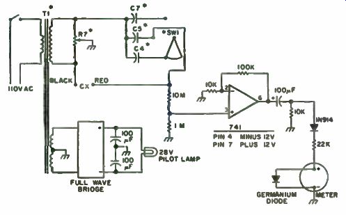 ![]() Fig. 4-20. Original components. The output of the bridge when unbalanced can run as high as 30 volts, and at balance, depending on the range in use, can be as low as a few tenths of a volt. The divider reduces this variation of amplitudes by a factor of 11 to 1 void real problems with the op amp, which is set up for a gain of 10. The balance indicator is a meter salvaged from an old tape machine and serves quite nicely in this function with the advantage over the old magic eye in that it does not need to be shielded from ambient light. Here is a simple way to set up the proper series resistor to scale the meter. Unbalance the bridge and insert just enough series resistance so that the meter pins full scale. Then shunt the meter with the germanium signal diode, as shown in Fig. 4-20, and the meter indication should drop about one or two scale divisions. This simple method obviates any fuss and feathers log amp problems to handle the signal variations that the op amp handles. It allows for a very nice null reading to show balance, while saving the meter from overload. The original transformer has two windings-one driving the bridge and the other a center-tapped winding which formerly lit the filaments of the tubes. This latter winding is used to feed a full-wave bridge, producing the DC voltages needed for the 741 op amp. Putting a 28-volt pilot lamp across the output of the supply serves the second purpose of acting as a bleeder. Be sure to ground the dial plate of the bridge to the ground terminal of the supply. If you use a metal cabinet, keep the bridge circuitry isolated from it, as it may upset bridge calibration on the low capacity scale. -- Next: Resistance and Impedance Measurers