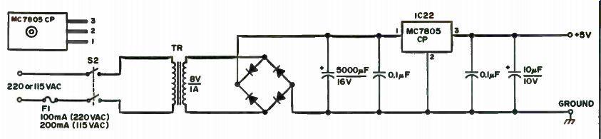 Capacitor Co tunes with Li to the harmonic frequency of the crystal X. The coupling coil is 2 turns of insulated wire (24 SWG) over the "cold" end of L1. The buffer stage Q3 must safely drive the buffer gate IC14A. The easiest way to check if IC14A is driven enough is to measure the voltage with an rf diode voltmeter at pin 11 of IC14. If the rf voltage is low or unstable, change the value of the base resistor of transistor Q3 or the transistor itself. Unstable or low rf voltages (e.g., under 2v) will result in unstable or no display of the measured value of capacity. So get it to work one hundred percent. This is probably the only difficult part of the whole instrument. The rf output from IC14A is fed into another gate IC ( 14B) and divided by 100 (IC15 and IC16). Range switch SIB blocks IC16 for range 1 via IC20E, so that at the output (pin 11) of IC16 there is logical " 1." At the output of IC14C (pin 3) is a 40 MHz signal. If the range switch S1B is in position 2, gate IC14B is blocked, the output (pin 8) is logical "1," IC15 and IC16 divide the 40 MHz by 100 and the 400 kHz output (pin 11 of IC16) goes via IC14C to pin 4 of the gate IC14D. One half of IC17 (dual Schmitt trigger) works as an oscillator; a 47 uF 10 V solid tantalum capacitor and a 470 ohm resistor make up the timing circuit for approximately 20 Hz. This frequency is fed into IC18 (an SN7490 decade counter). The B, C and D outputs of IC18 are used to produce trigger, strobe and reset pulses. Trigger pulse "4" from pin 8 of IC18 is reshaped in the second half of IC17 and fed into IC21 (the SN74121 MMV), which produces a pulse with length directly proportional to the value of capacitor Cx (+C F). This pulse (at pin 6 of IC21) is used to enable gate IC14D. The output from IC14D (pin 6) goes to the counter input. Strobe impulse "6" is formed by the B and C outputs from IC18 (the decade counter) in the gate IC19B (SN7400). The output is a negative impulse and, as the SN7475 latches require positive pulses, it is inverted in one of the hex inverters (IC20B) of SN7404. Reset 1 and 4 pulses are common for both ranges. The D output from IC18 goes via IC19A to Reset 1 (negative pulse). Reset 2 must be a positive pulse- thus, Reset 1 is inverted in IC20A. For range 1, the Reset 3 pulse must be positive. With S1B in position 1, gate IC19C is open but the output pulse is negative--it is therefore inverted in IC20C. The Reset 2 output is logical "0", as IC19D is blocked. For range 2, the Reset 2 pulse must be positive. Switch SIB is in position 2 and gate IC19D is open, while IC19C is blocked and the Reset 3 output is logical "0." Power Supply. The last part of the C-meter is the power supply. It is very simple, thanks to IC22 (MC7805CP). This integrated circuit has built-in overcurrent and thermal protection and is a very good buy for the money (Fig. 4-5). The output voltage should be very close to +5v (according to the specifications ±0.2v, but there are a few worse than ±0.1v). It is rated for 750 mA minimum (short circuit current limit) and this value just suits our requirement (about 700 mA with display "88881. The typical input-output voltage differential of the MC7805CP is 2v, but to be on the safe side use 8v AC. With a large smoothing capacitor the input voltage is over 9v DC. Do not try to go under this value (at nominal mains voltage); otherwise, when the mains voltage drops, you are in trouble. A small capacitor across the output improves transient response. The connection between the 5000 uF and the input of IC22 should be as short as possible. Use heavy wires-they eliminate voltage drops and improve stability.