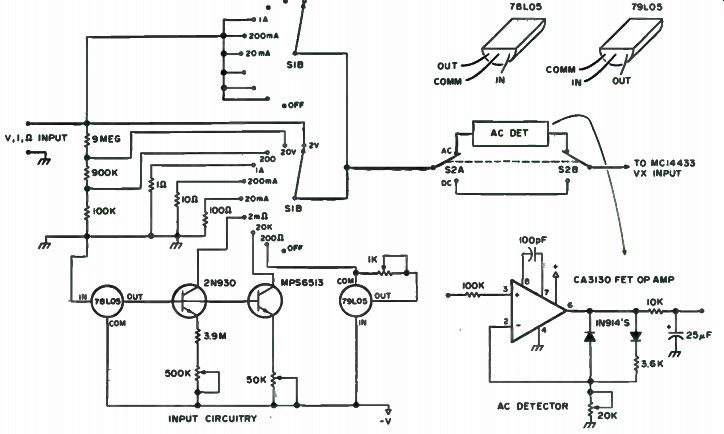 ... finds use in digital thermometers, digital scales, remote AID, AID control systems and MPU systems, and has an input impedance of greater than 1000 megohms! This A/D system performs a ratio-metric AID conversion. That is, the unknown input voltage, Vx, is measured as a ratio of the reference voltage, Vref. Therefore, a full scale voltage of 1.999v requires a reference voltage of 2.000v, while a full scale voltage of 199.9 mV requires a reference voltage of 200 mV. Both the Vx and Vref are high impedance inputs. The circuit in Fig. 7-10 performs parameter-to-voltage conversions and scaling and function switching. The AC/DC DPST switch changes the input path and the signal is then fed into the MC14433. A 10 megohm voltage divider consisting of three precision resistors provides 2, 20 and 200 volt ranges. Three precision shunt resistors are connected directly from the input to ground, providing 1 A, 200 mA and 20 mA scales. The resistance scales are established with calibrated current sources using the MC78L05 and MC79L05 voltage regulators. A stable 5 volts above the minus supply is produced by the 78L05 positive regulator. The current sources are simple base emitter biased transistors. A 2N930 with a guaranteed beta at 1 microamp is used for the 2 megohm scale, and an MPS6513 is used as a 0.1 mA source for the 20k ohm scale. Each is adjusted by a single 10-turn pot. The 200 ohm scale current source uses a 79L05 negative regulator. Its input is connected to the negative supply and a scaling resistor is placed between the common and output pins. When not in use, this circuit draws only a few microamps of bias current, even though it sinks 10 mA when measuring a connected load. All current sources are biased from the minus supply to increase battery life; thus, all resistance scales produce a negative sign on the display. When breadboarding the circuit, you could take the minus supply for the input circuitry from the common -6.2v bus. The only problem with this is that the 78 and 79L05 regulators require about 2 to 3 volts over the output voltage to work properly. Thus, the regulators will require at least 7 to 8 volts on the input to give 5 volts on the output. For this reason, it is recommended that you use 9 volt batteries. Note that absolute maximum voltages on the MC14433 are + and - 8v, so be sure to drop that portion of it somehow.