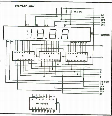 The real substance of the project is shown in Figs. 7-11 and 7-12. Three MC14543N LCD latch/decoder drivers are used to de-multiplex, decode the