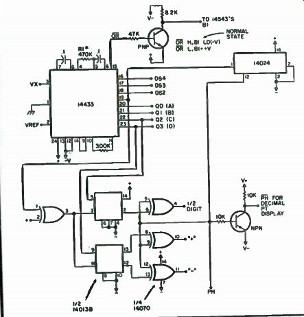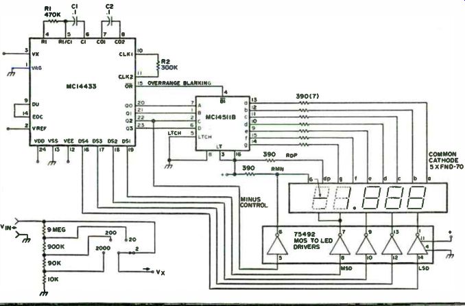 three digits and drive the LCD. The half digit and polarity are de-multiplexed with the MC14013B dual D flip-flop. Since the LCD requires an AC signal across it, the low frequency square wave drive for the LCD is derived from the MC14024 binary counter, which divides the digit select output from the AID. Although this is a convenient way to obtain the required square wave, it is not necessary to take it from here. The frequency should be about 4 kHz, as this will provide for the best contrast on the display unit. This low frequency square wave is connected to the backplane of the LCD and to the individual segments through the combination of the output circuitry of the 543B and the exclusive OR gates at the outputs of the 013B. All of the decimal points are tied to PH through a 1 megohm resistor, and, to display a particular DP, it is switched to PH. The overrange pin ( 15) goes low when Vx exceeds Vref. It is normally high. The 543Bs require a ground on pins 7 (blanking) to display. In our case, the ground is actually the most negative supply (to get the maximum amount of voltage swing on the output). This normally high OR pin on the 433 is tied to a PNP transistor, which is tied between - V and +V. In its normal state, the transistor is not conducting, thus allowing the - V to be on the collector. When the input goes low, indicating an overrange condition, the transistor conducts and places a high (+) on the blanking input of the 543s, thus blanking them. Note that the first digit has no provision for blanking. You can wire-wrap the LCD socket and the 543Bs. One reason for this is because the pins of the socket of the LCD are very close together. Calibration. The first thing to do in the way of calibration is to set the reference voltage. Note on the schematic that it can be set up for 2 volts or 200 mV full scale (Figs. 7-13, 7-14 and 7-15). It should be set for 2 volts due to possible noise problems, but, even with the 2 volt scale, it can be read to 0.001 volt. Be sure to be accurate with this reference voltage, as the accuracy of the entire instrument depends upon it. A short word should be said about the quality of components used in the frequency determining resistors and capacitors, especially in the capacitors. These 0.1 uF caps should be of the high quality polyester or mylar. Using cheap caps here can lead to inaccurate readings. If you used precision resistors for the voltage divider network, the next step is to calibrate the ohms scales against known resistance values. Just tweak the control until the correct value is displayed. If you used pots in place of the precision resistors (in the interest of saving money), you must set these up. The way to do this is to get a calibrated voltage source. Set the voltmeter to the 200 volt range, and adjust the 100k pot for a correct reading on the meter with about 90 to 120 volts applied to the input. Watch out, as the 433 doesn't really like all that voltage, especially if it is applied directly to the 2v scale. It might blank out forever! After you have calibrated the 200 volt scale, don't touch that pot again. Apply about 16 volts to the input and adjust the 900k pot for a correct reading. Next, do the same thing for the 2 volt scale, using the appropriate voltages. After this, you will probably have to touch each of the pots up, as each will interact with the other. With a little time, you can save yourself a little money, and probably have a more accurate meter than if you were to buy precision resistors! There are a few things which you should be on guard for and those are in the area of the AC detector circuit. Since this is essentially an amplifier/ detector circuit, anything that is placed on the input will show up as a DC potential on the output. The Ac detector circuit takes more time to refine than does the rest of the DVOM. On the switch assembly, don't run the PH and PH lines with unshielded wire because the input is a very high impedance, and therefore doesn't take very much to drive it. So, a little shielding and careful placement should take care of it.