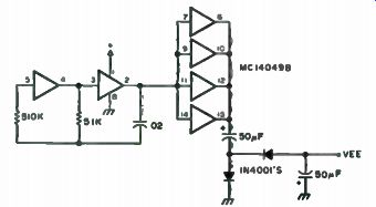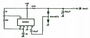 This project is really a bare-bones layout with a minimum amount of functions, but all that is required to upgrade to a full function DVM is a few more resistors and switches. Since the MC14433 requires both a positive and a negative supply, it necessitates either the use of two batteries, or some other way to generate a negative voltage from a positive source. This is really quite easy and there are a couple of different methods to obtain it. One easy way to get it is by the method shown in Fig. 7-5. In this example, a 9 volt supply can be used, with 3v between Vag and Vee, leaving 6v for Vac' to Vag. This system leaves a comfortable margin or battery degeneration (end of life). Note that due to the current requirements of the LEDs, this method is recommended for use only with LCDs. Another method is shown in Fig. 7-6. This method uses the old reliable NE555. Since this thing generates a square wave, why not use only the negative cycle? Looking at the circuit in Fig. 7-7, we see that the 555 is connected in a regular oscillator fashion. The ... ... output, pin 3, is fed through a capacitor to the junction of two diodes. Dl allows the negative cycle to pass through it, and D2 allows the positive cycle to go through it to ground. After filtering, this negative wave is amazingly transformed into DC! An idea for saving money is to use potentiometers in the area of precision resistors on the input circuitry. Sure, precision resistors would be the way to go, but as long as we are being cheap about this thing, let's go all the way. There are definite values of resistors required for proper operation of the input circuitry, but instead of trying to find the closest thing in your junk box and hoping for the best, we will start with a value less than what is required and supplement it with a miniature 10 turn pot, which on the surplus market is relatively inexpensive. That way, you will have an even more precise resistor combination than you could get by ordering it. Although a DVM can be made on a printed circuit board, a perfboard with sockets will do just fine, as parts layout is not really critical. One precaution, though: Try to keep wires away from the clock resistor and wave-forming circuits. Unlike with TTL devices, one cannot leave unconnected leads unconnected. Due to the extremely high impedance of these CMOS devices, you must tie the unused leads to a high or to a low. This circuit can be used with LEDs or LCDs with some changes, but in the interest of the local economy (your wallet), go with the popular FND-70 common cathode LEDs.